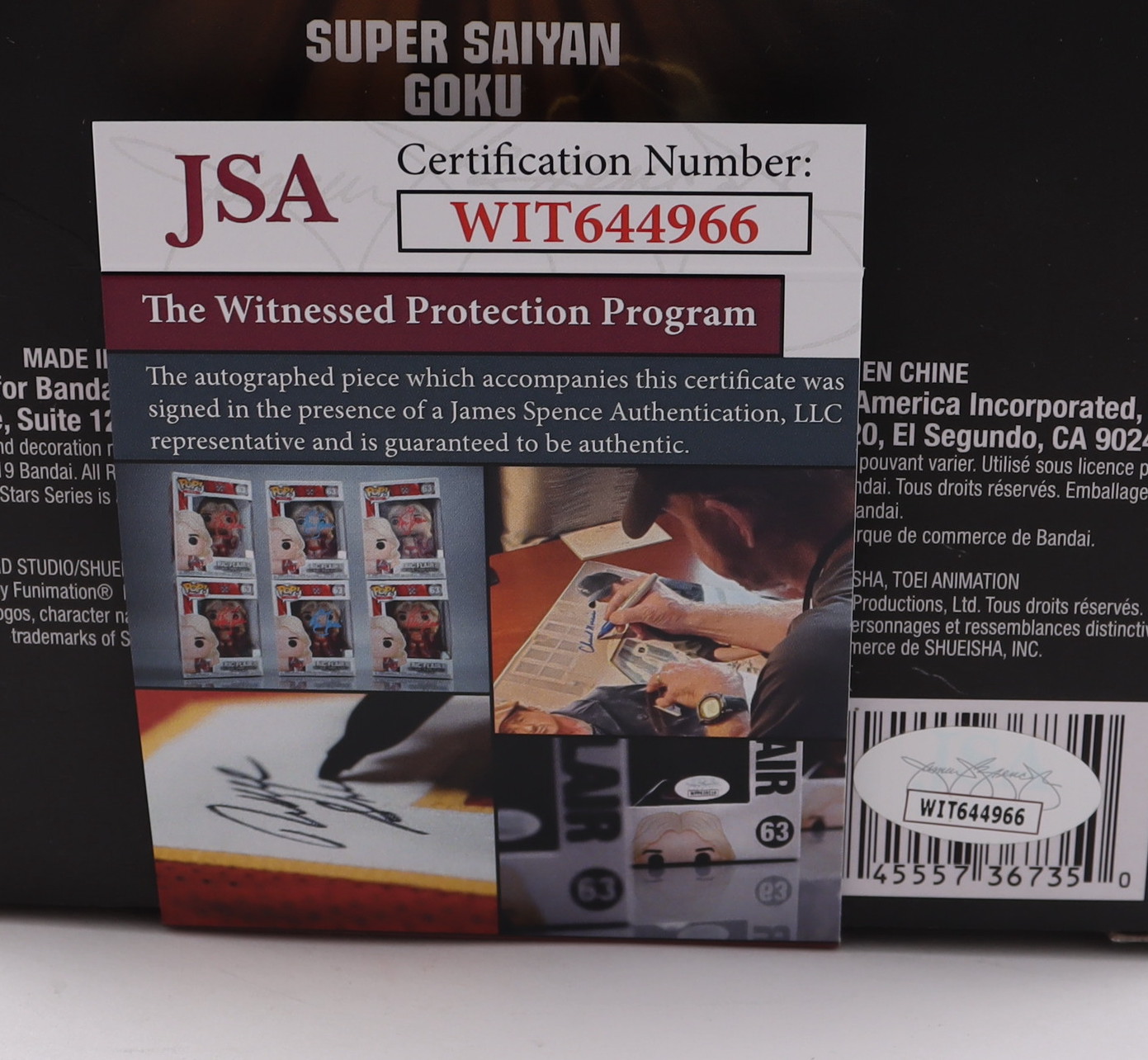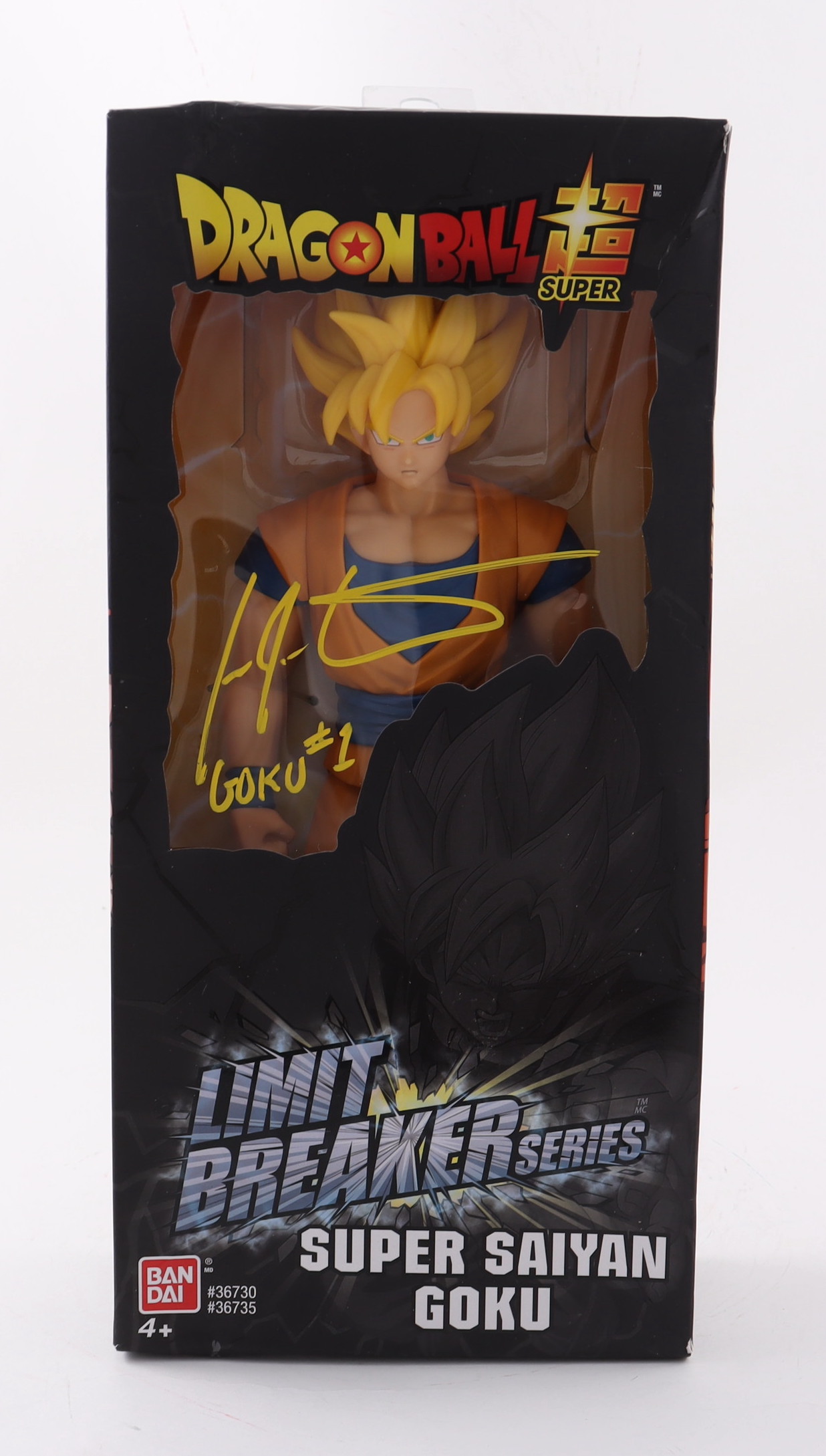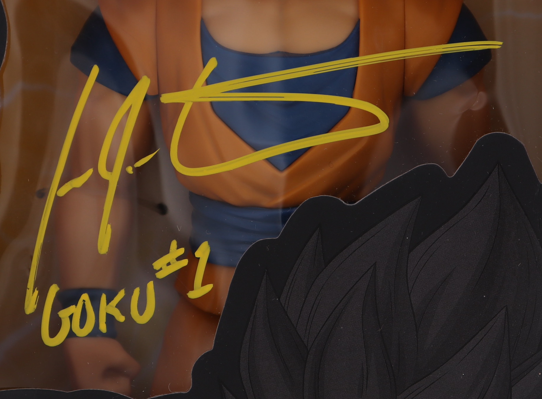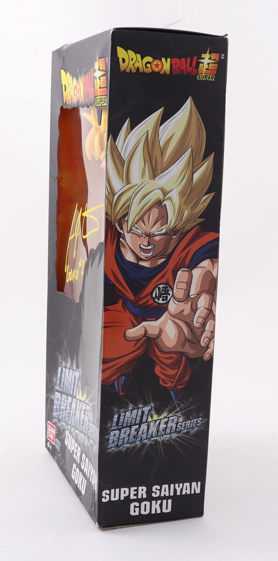 Bandai "Dragon Ball Super" Limit Breaker Series Super Saiyan Goku Figure measures approximately 11.8" tall and has been hand-signed and inscribed on the packaging by Ian James Corlett (Voice of Son Goku).