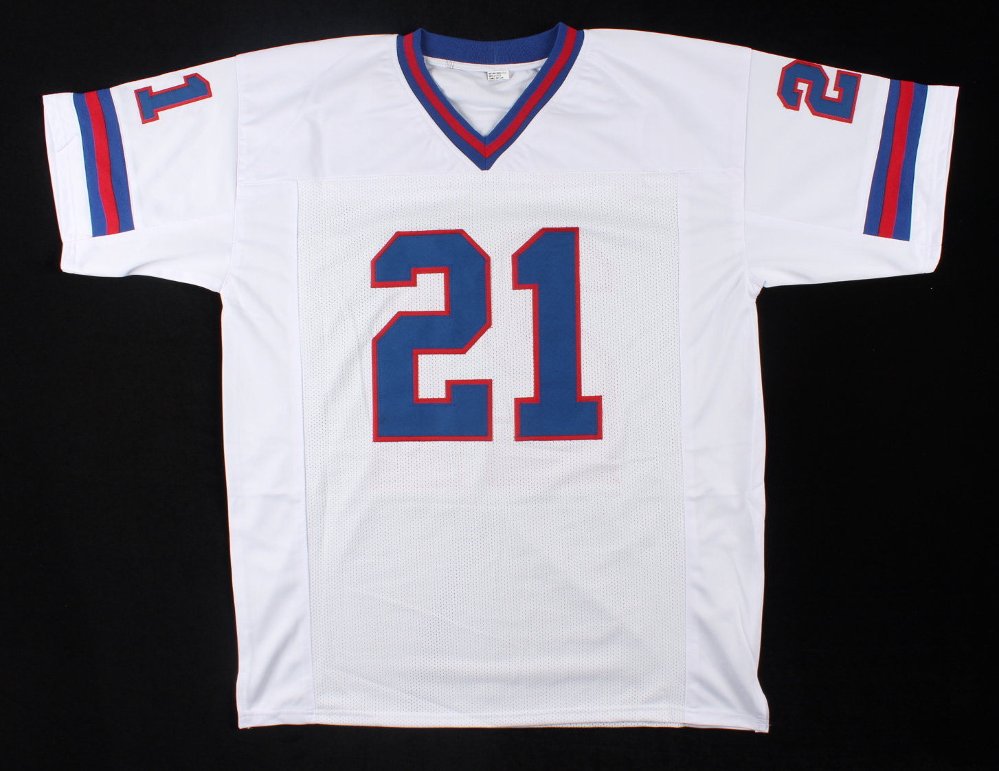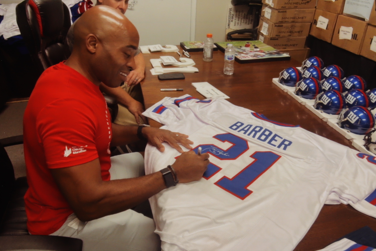 Custom on-field style jersey. Everything sewn on, size XL. Has been hand-signed and inscribed by Tiki Barber.