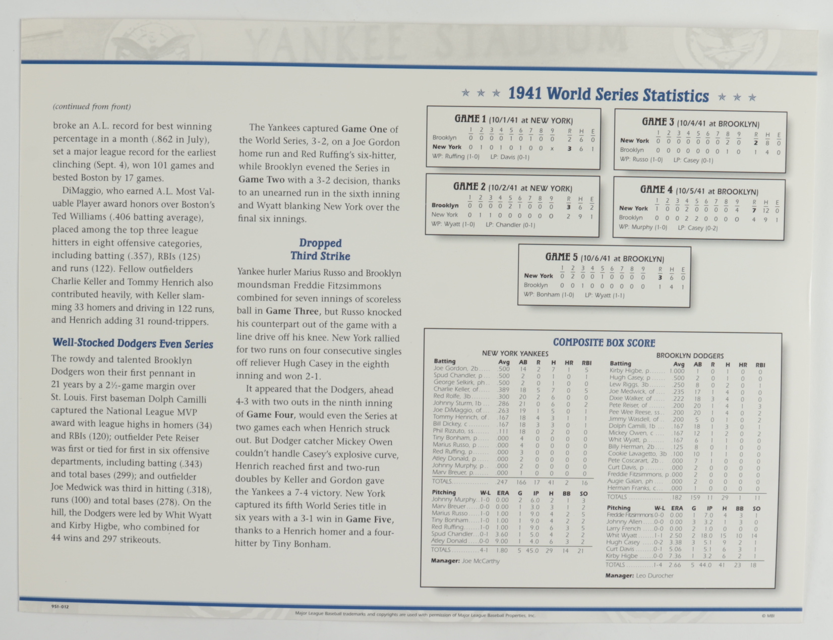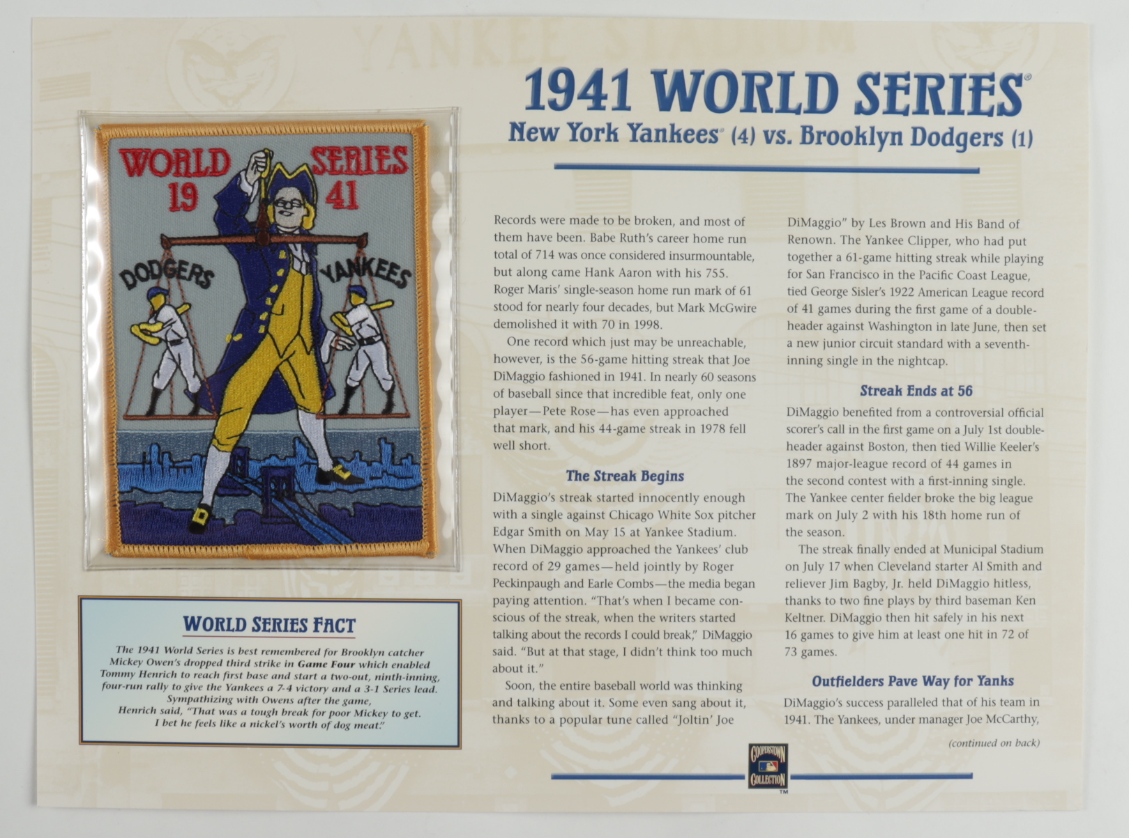 Official Cooperstown Collection 1941 World Series oversized Patch Card. Also includes a 9" x 12" scorecard.