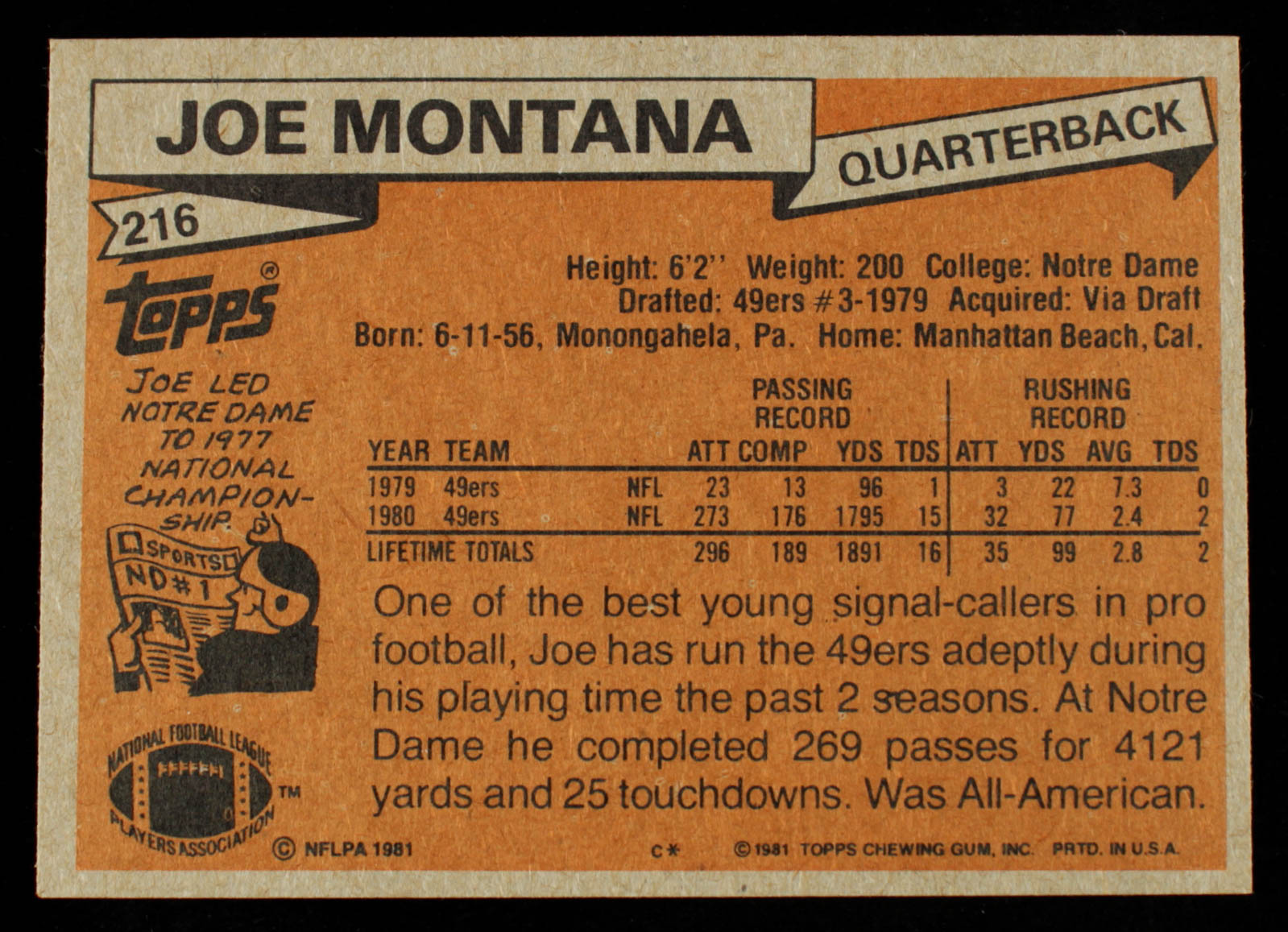Joe Montana 1981 Topps #216 RC