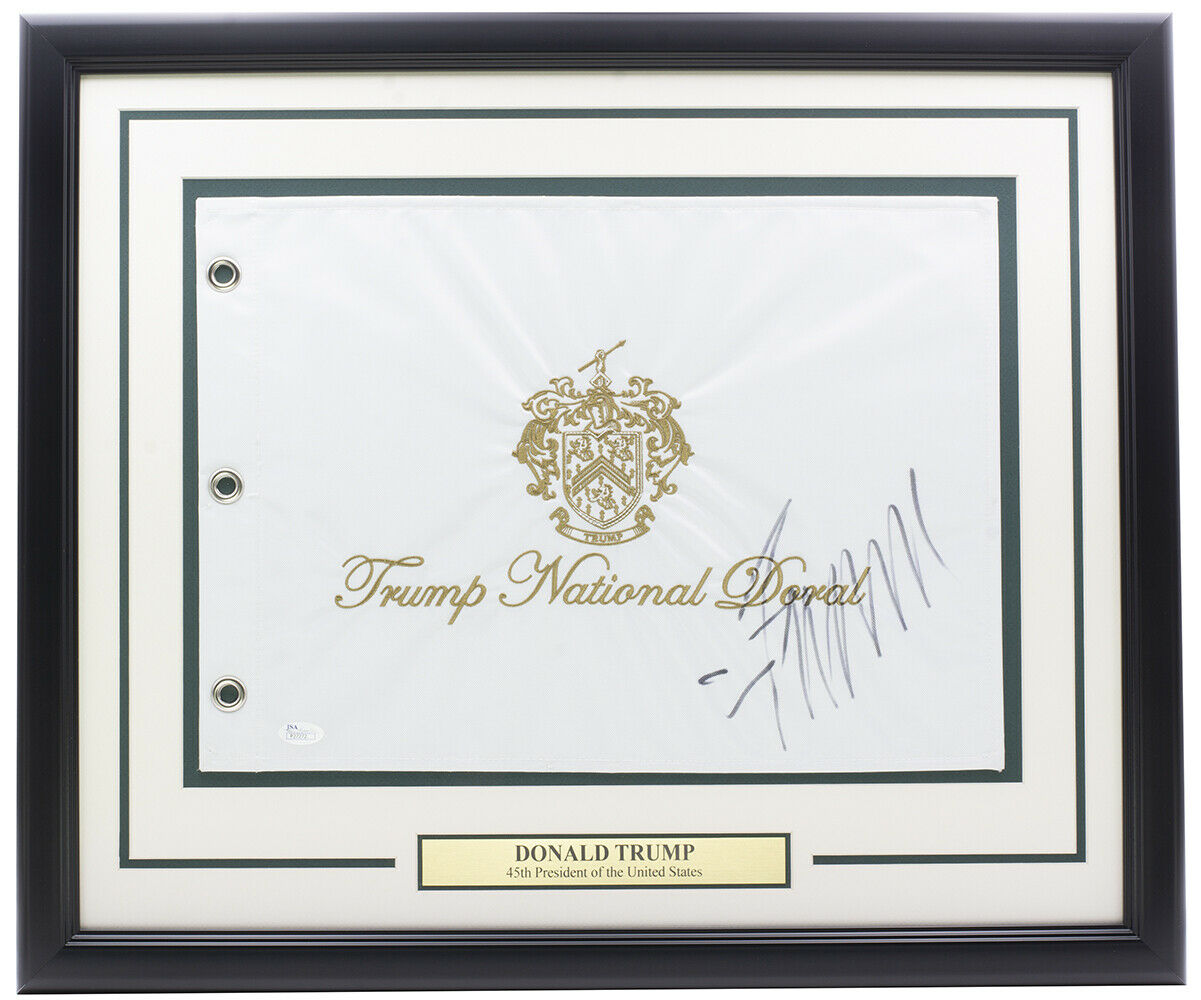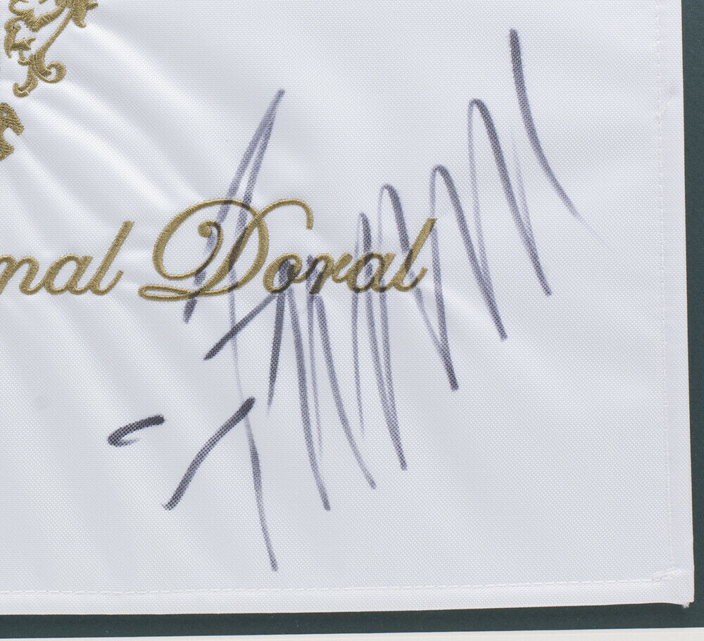 Custom frame measures approximately 22" x 27" in size and features a golf flag that has been hand signed by Donald Trump.