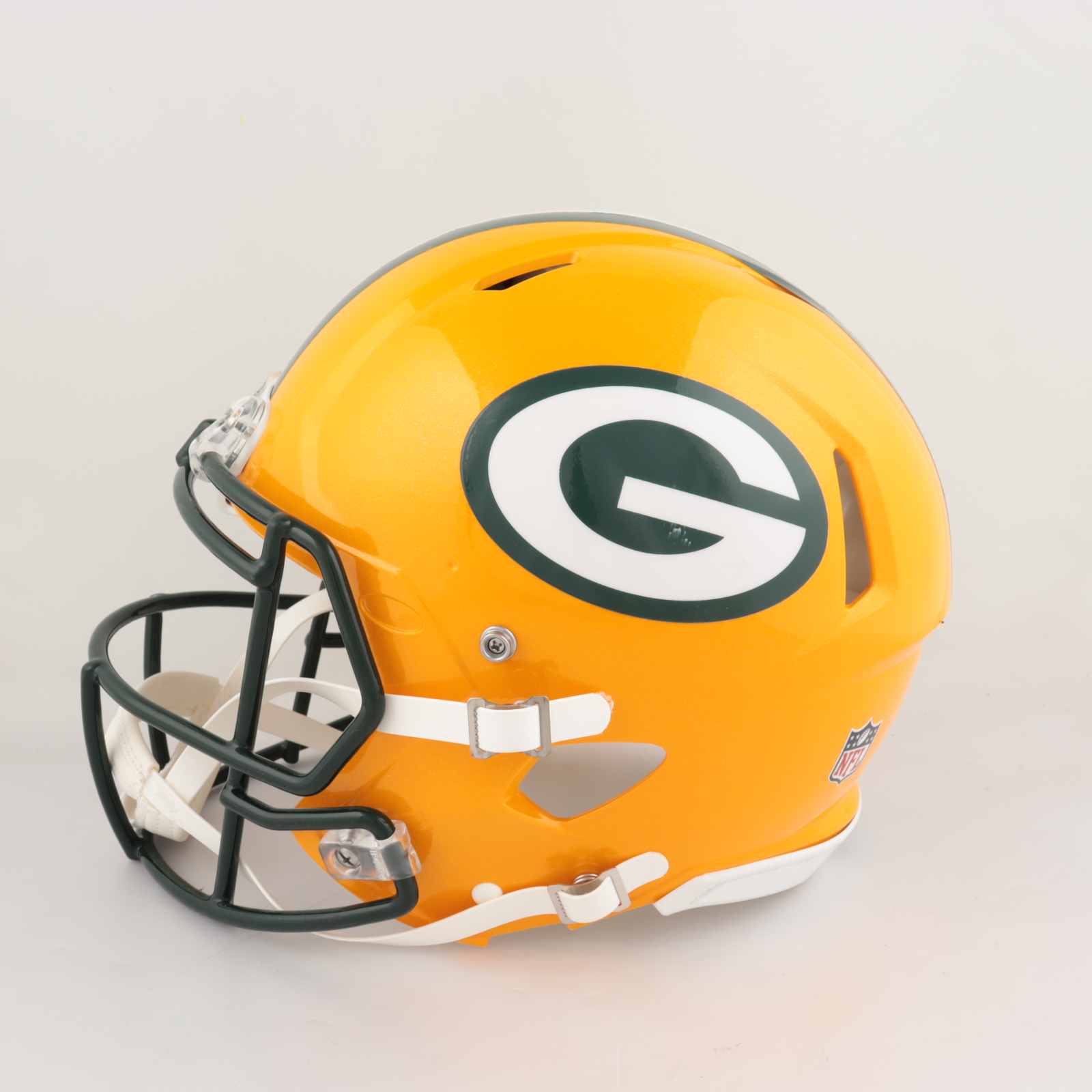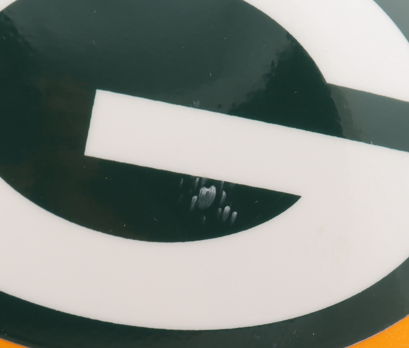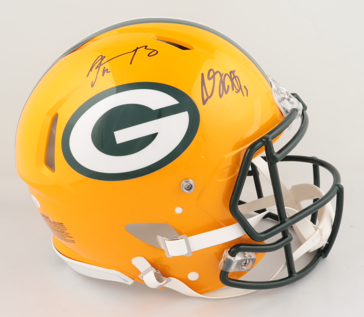 Riddell Green Bay Packers full-size authentic on-field Speed helmet. Has been hand-signed by Davante Adams and Aaron Rodgers.