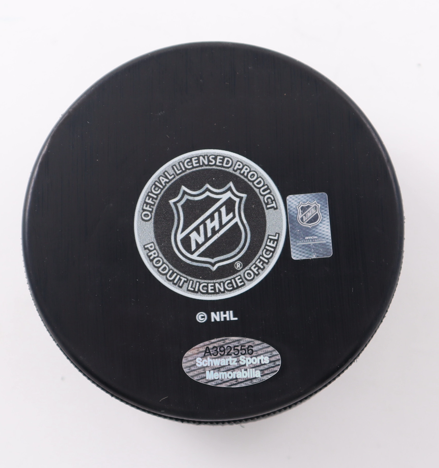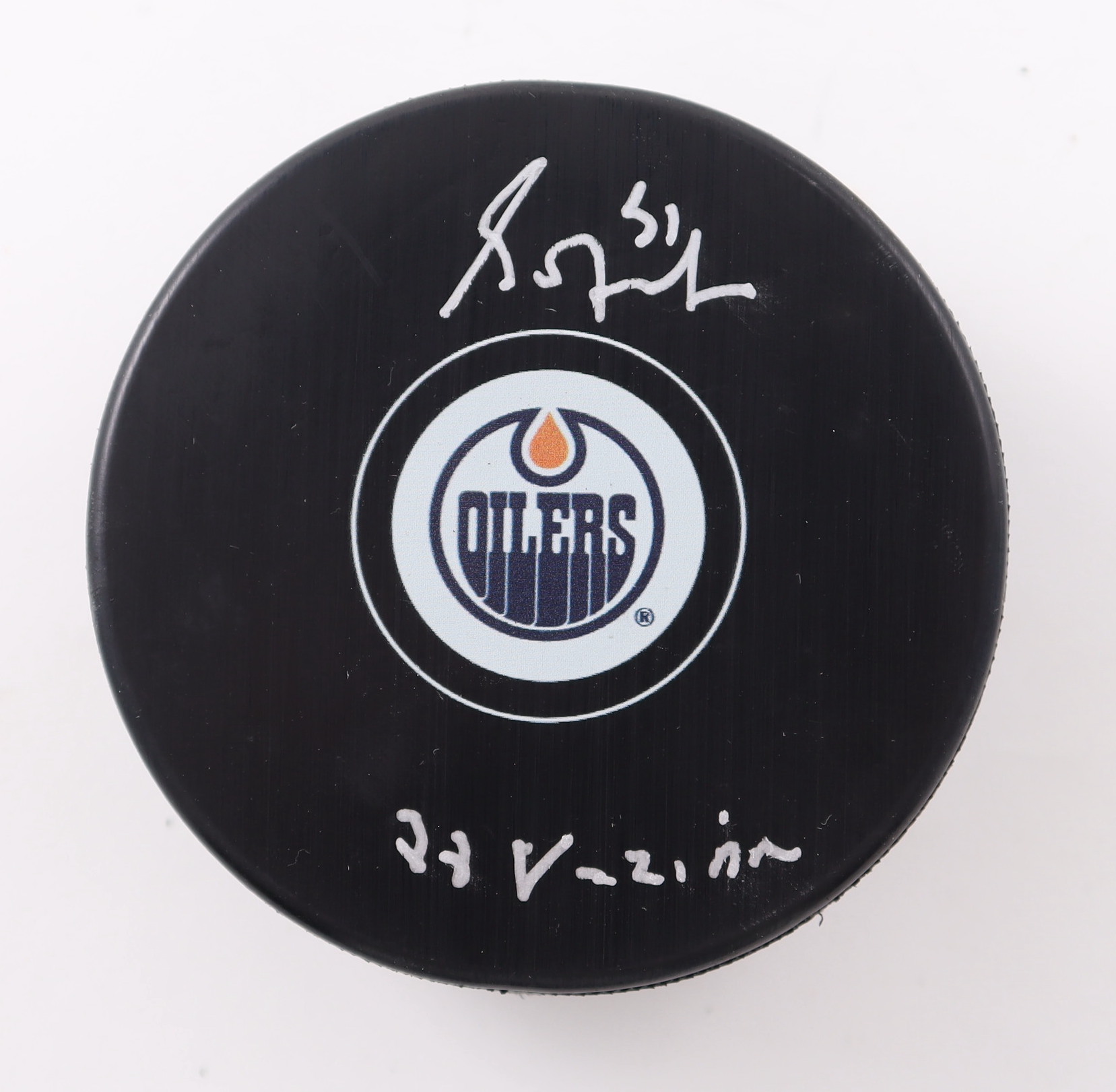 Grant Fuhr Signed Oilers Logo Hockey Puck Inscribed "88 Vezina" (Schwartz Sports COA)