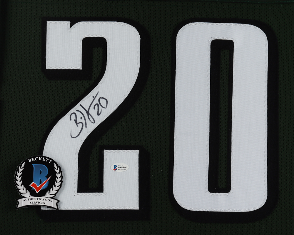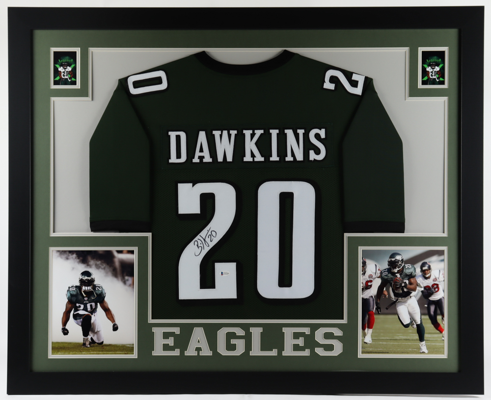 Custom frame measures approximately 35.75" x 43.75" in size and features a jersey that has been hand-signed by Brian Dawkins (HOF).