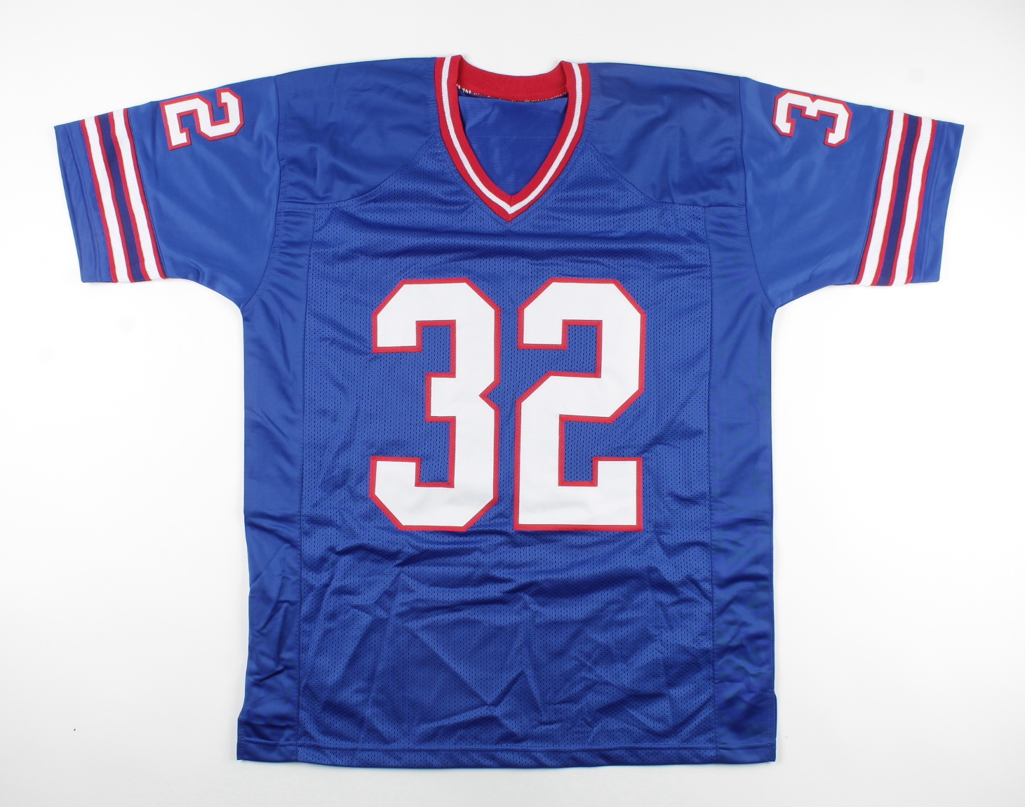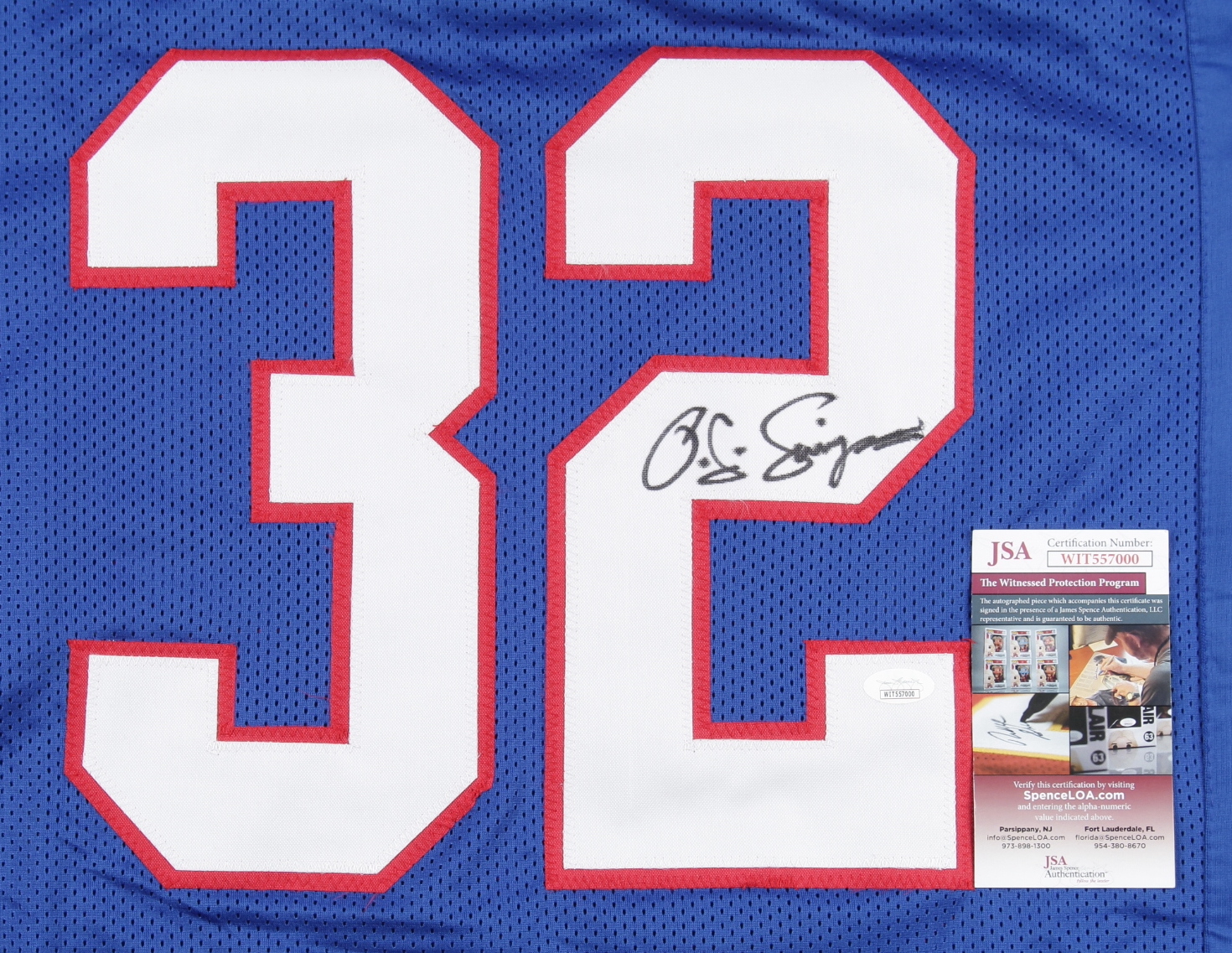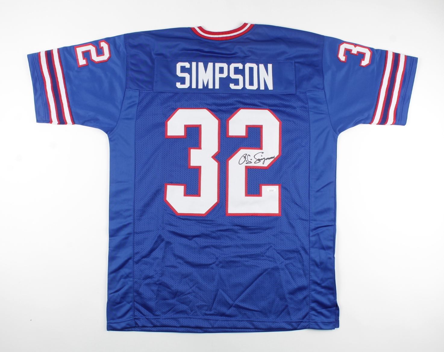 Custom on-field style jersey. Everything sewn on, size XL. Has been hand-signed by O.J. Simpson (HOF).