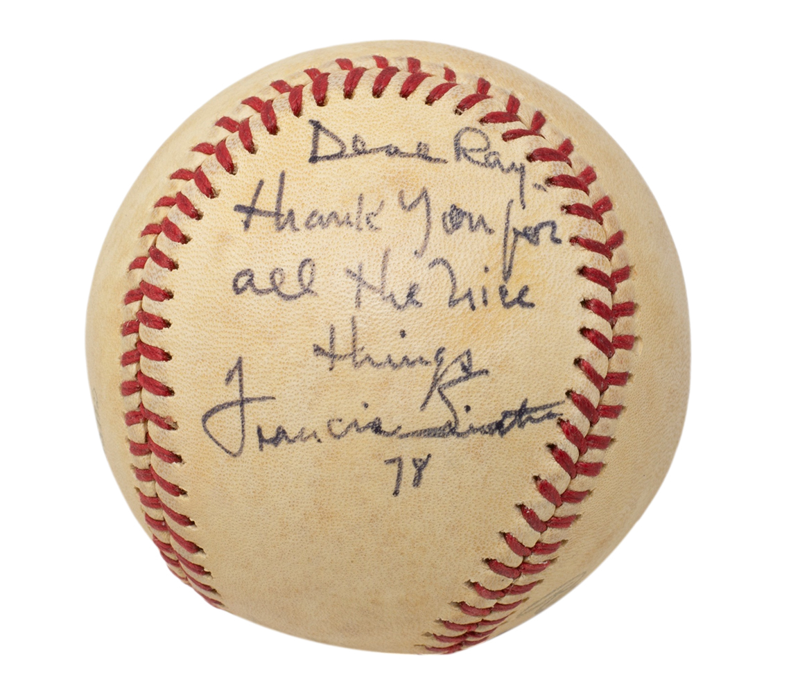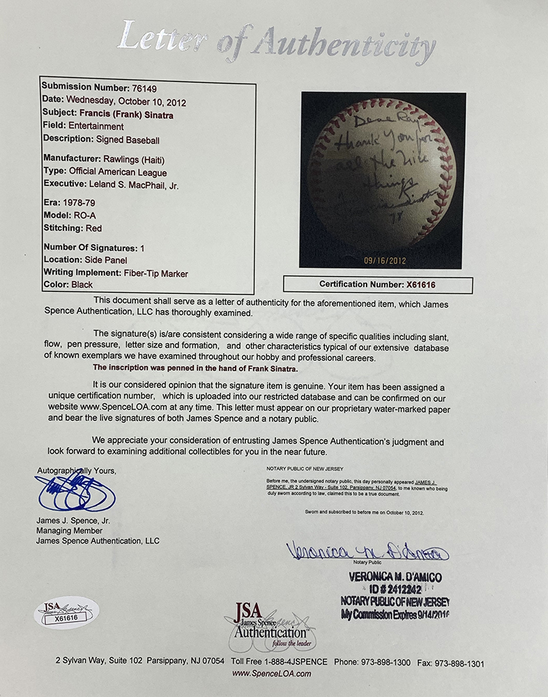 Frank Sinatra Signed OAL Baseball Inscribed "Thank You For All the Nice Things" & "78" With High-Quality Display Case (JSA LOA)