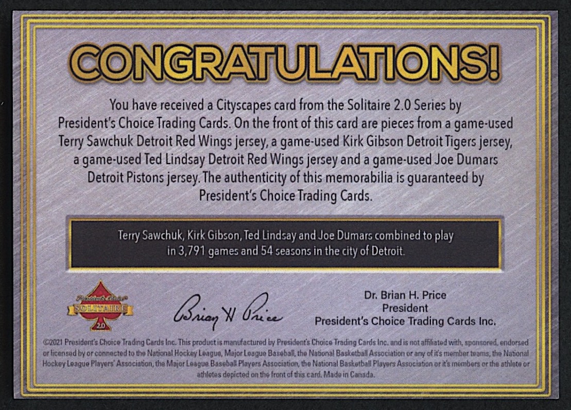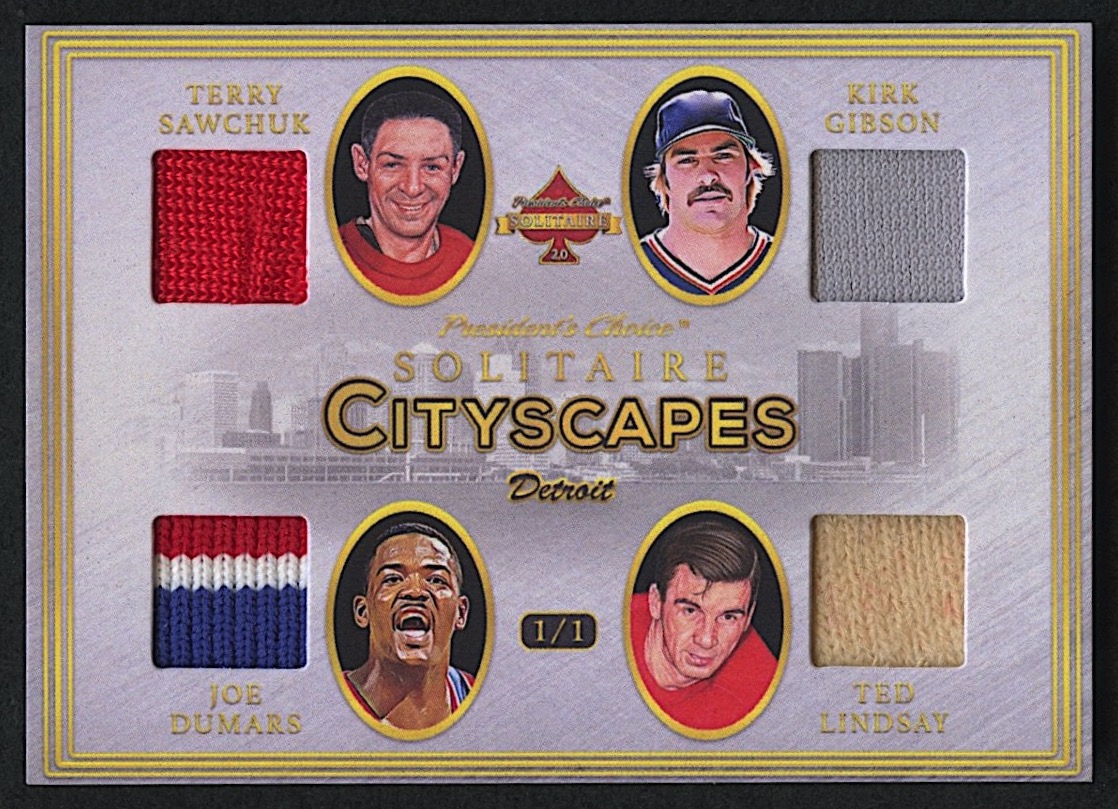 2021 President's Choice Solitaire "Cityscapes" Terry Sawchuk, Joe Dumars, Ted Lindsay & Kirk Gibson Quad Game-Used Relic - #1/1
