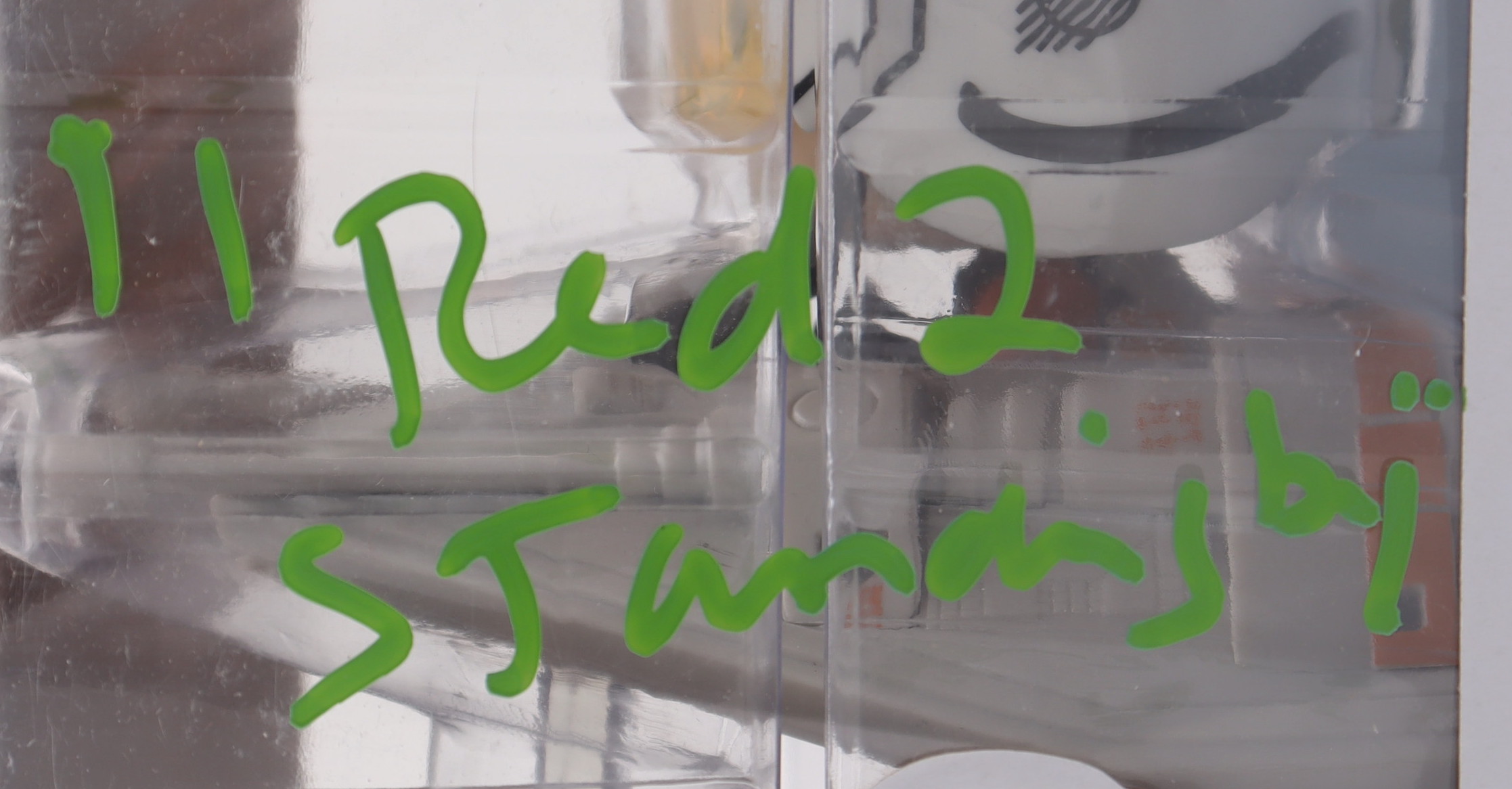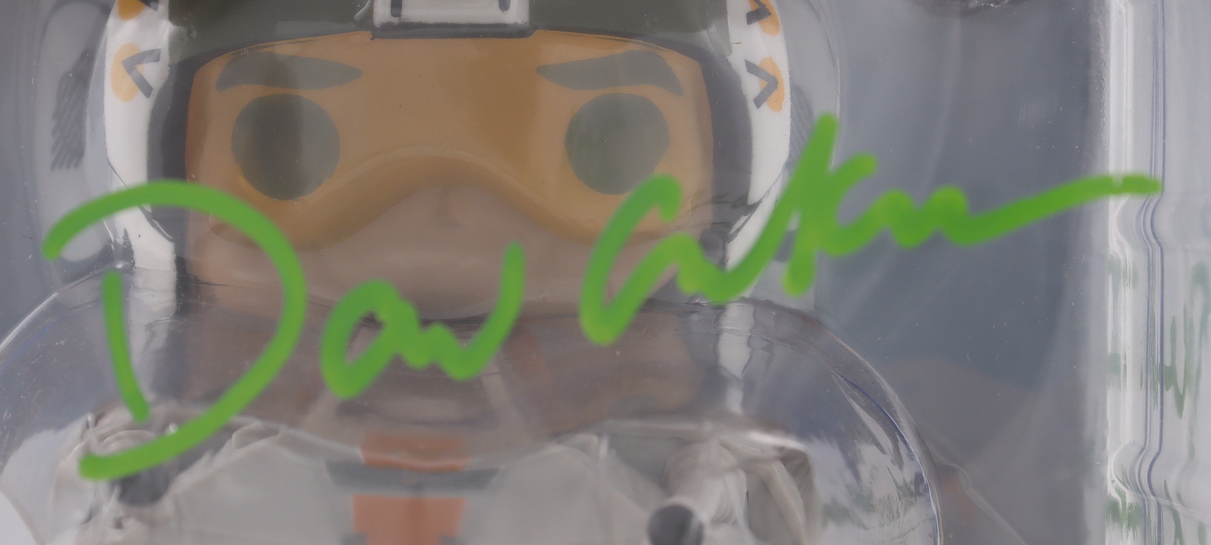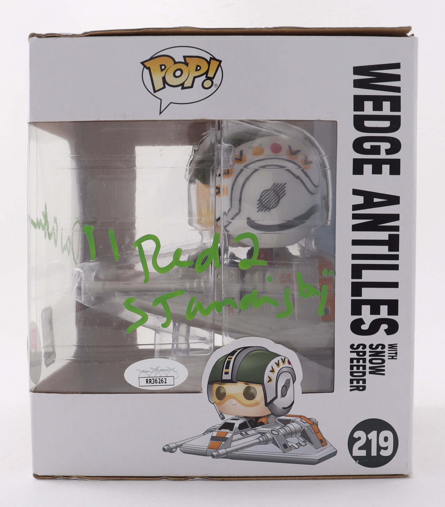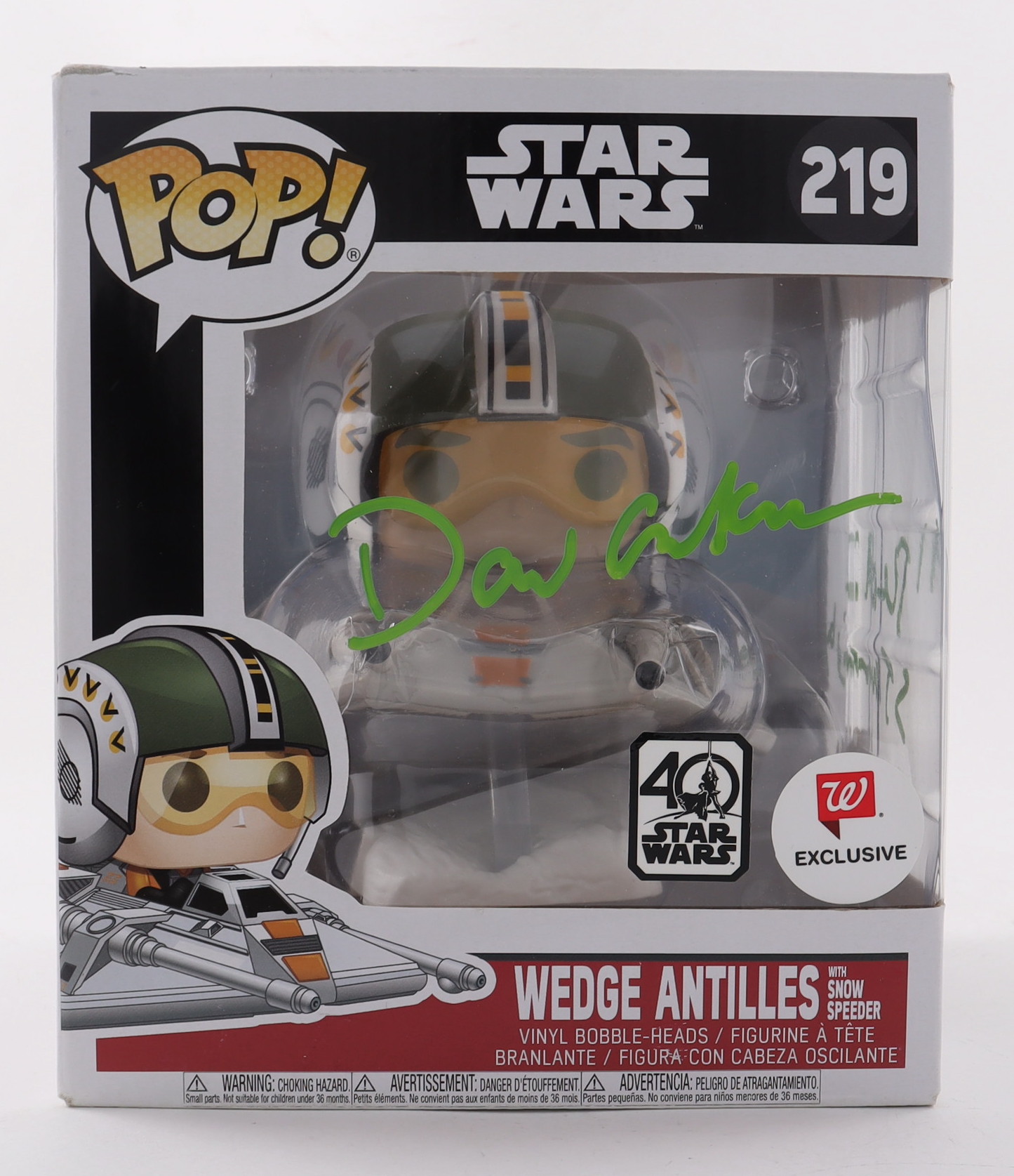 Funko Pop! Vinyl figure measures approximately 4" tall. Hand-signed and inscribed on the packaging by David Ankrum (Wedge Antilles). Please note, the packaging shows signs of handling.