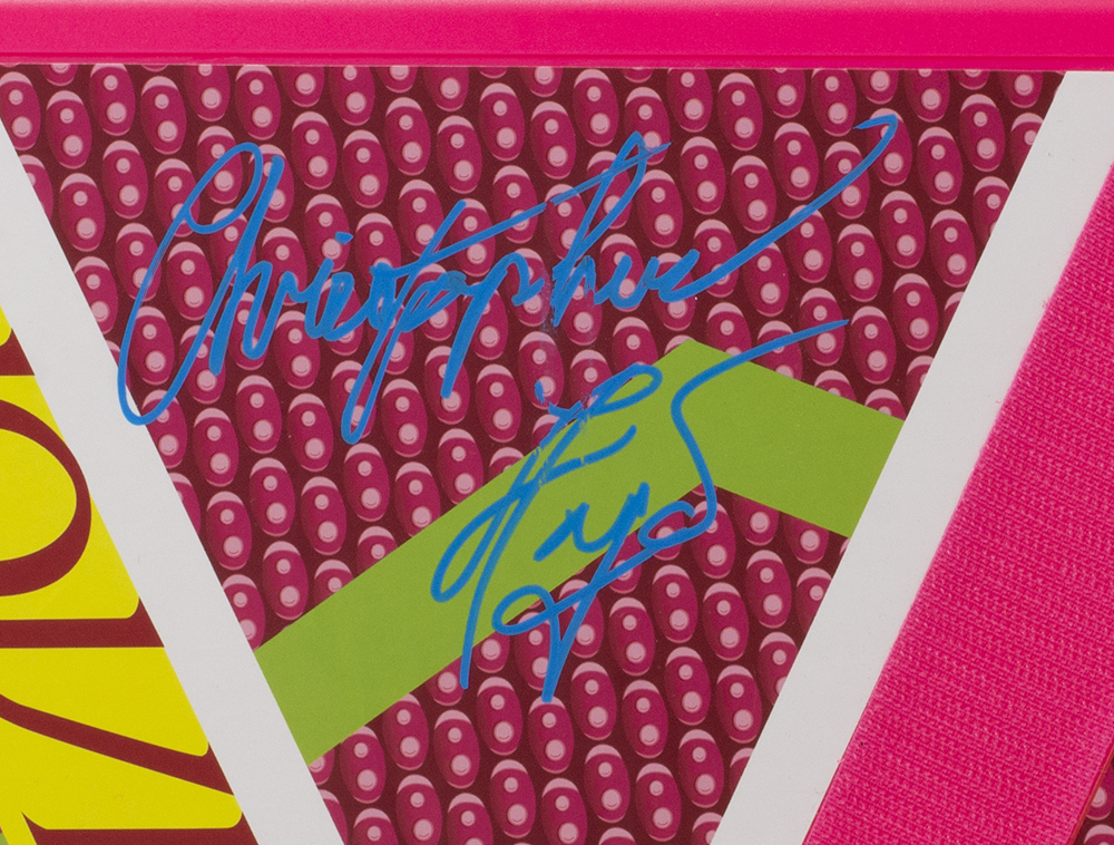 Full-size movie prop replica hoverboard. Hand-signed by Christopher Lloyd (Doc Brown) and Michael J. Fox (Marty McFly). Please note, see images regarding smudge on signatures.