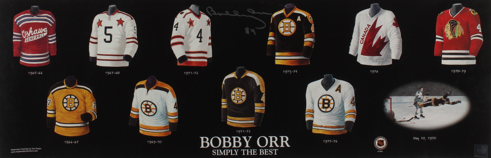 Photo measures 10" x 30" in size and is hand-signed by Bobby Orr (Boston Bruins, HOF). Please note, the photo shows some handling wear (creases) - see images for details regarding condition.