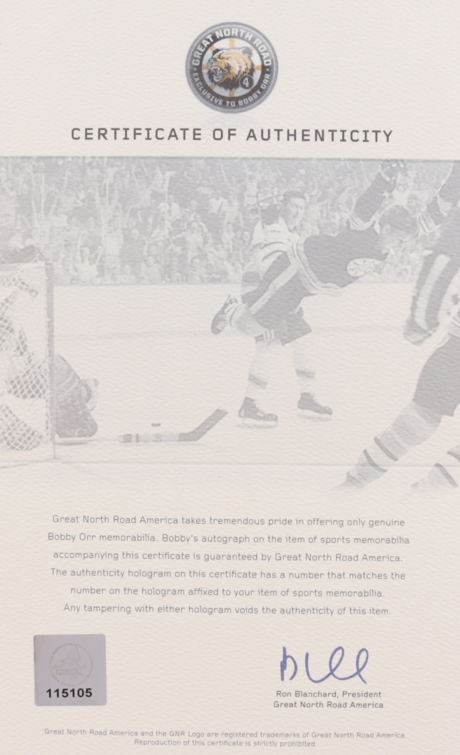 The autograph includes an official Bobby Orr hologram and matching COA from Great North Road for authenticity purposes. Authentication: Bobby Orr COA
