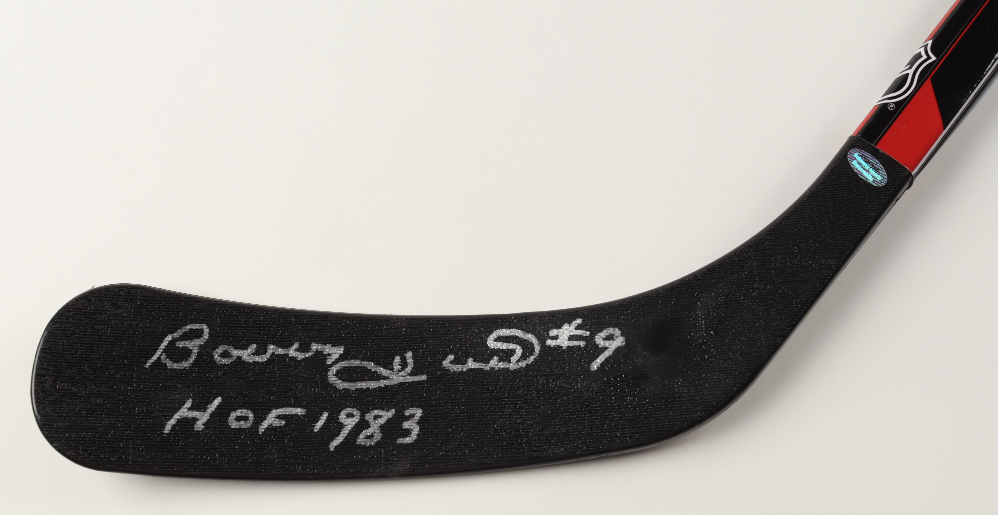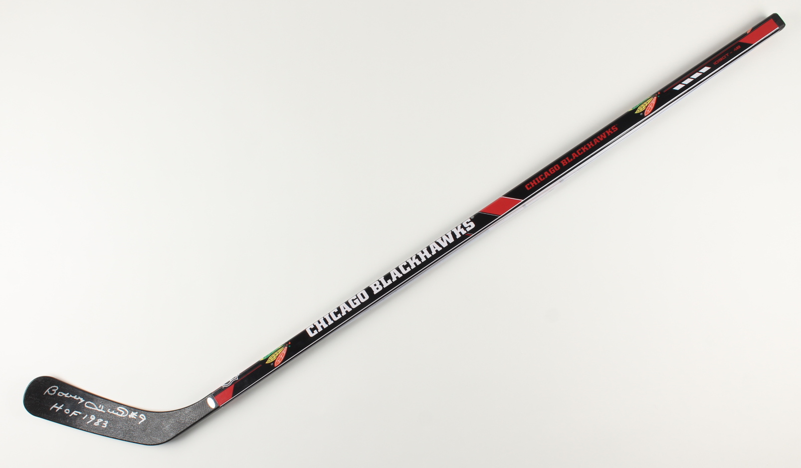 Franklin 1090T-48 full-size hockey stick. Hand-signed and inscribed by Bobby Hull (Chicago Blackhawks, HOF). Please note, the adhesive wrap around the stick shows signs of peeling.