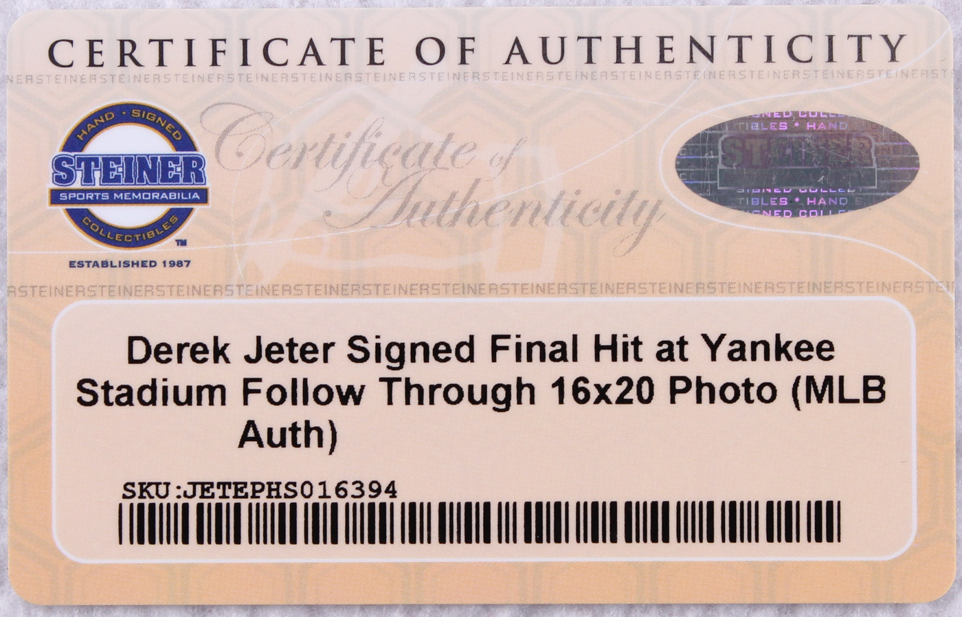 Derek Jeter Signed Yankees "Final Hit at Yankee Stadium" 16x20 Photo (Steiner COA & MLB Hologram)