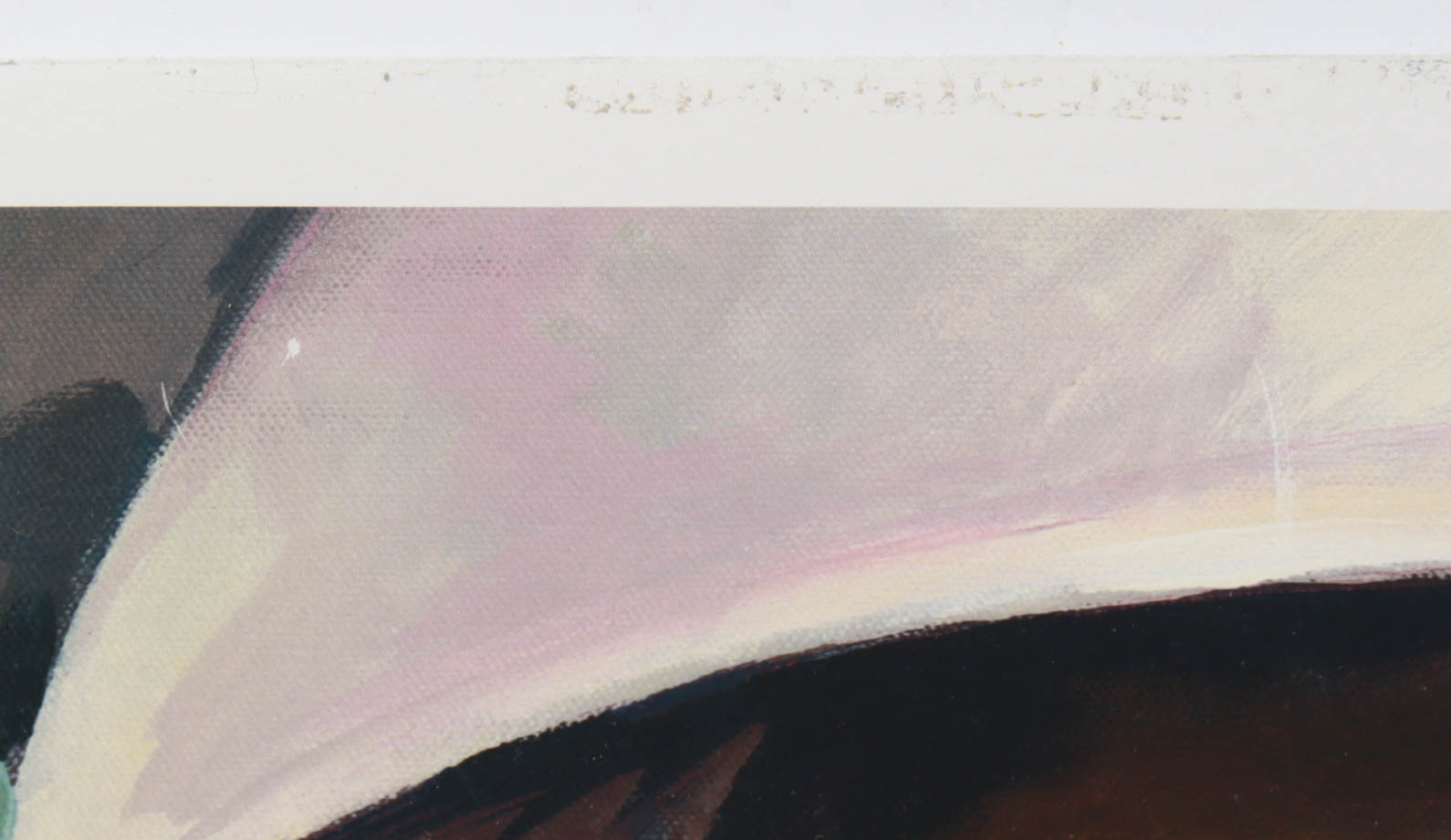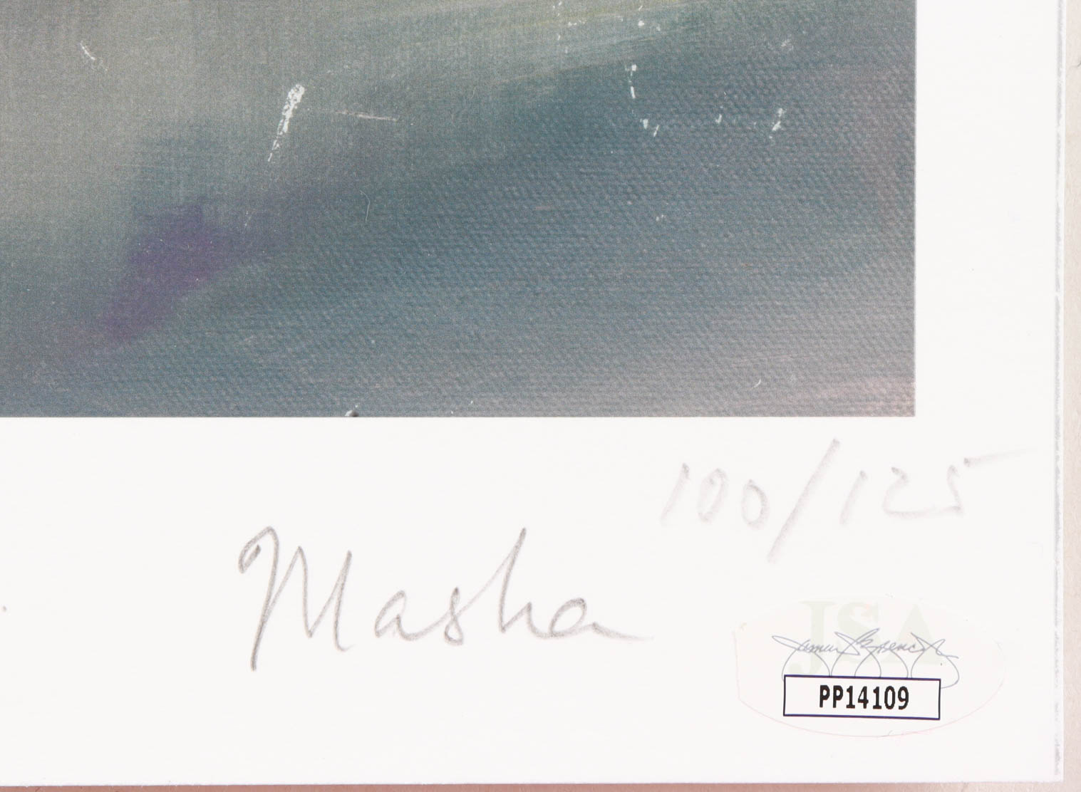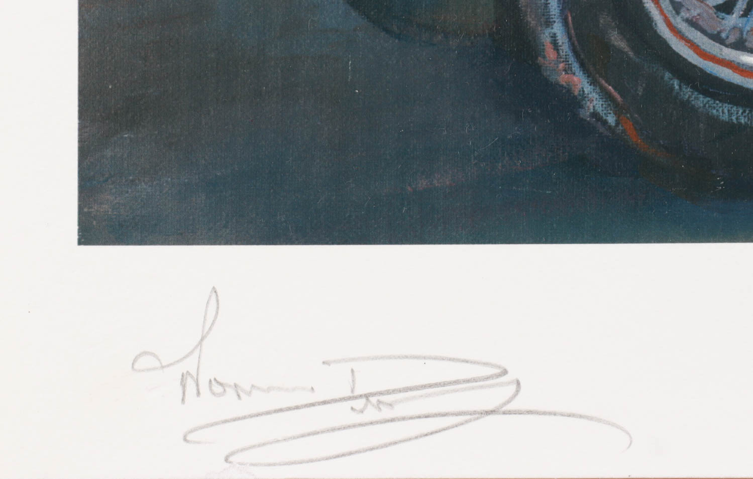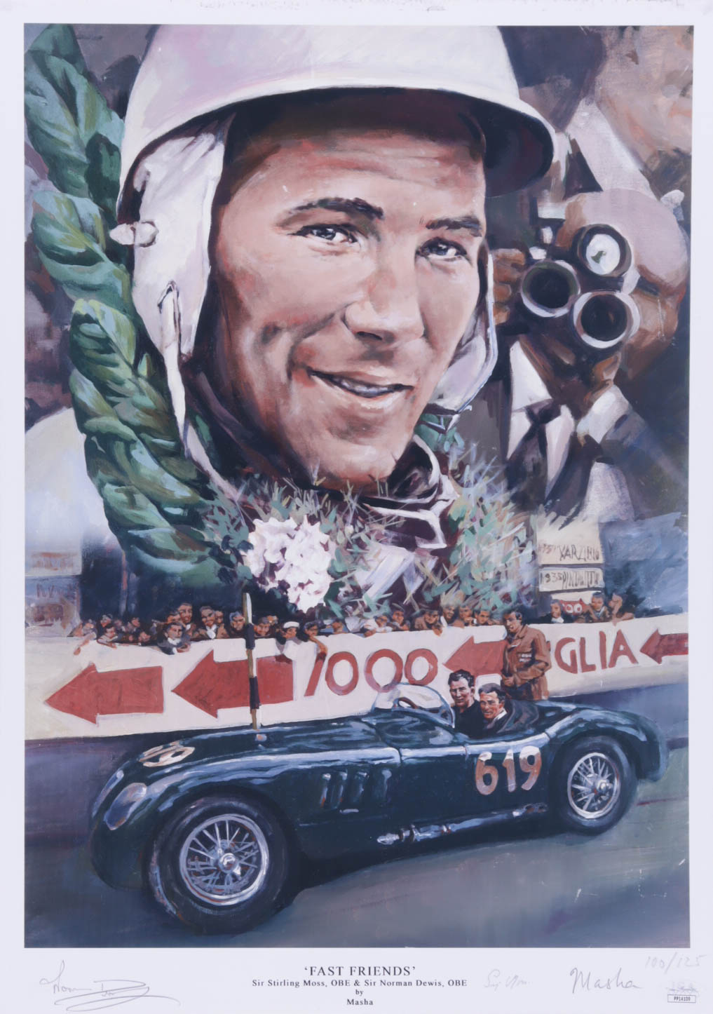 "Fast Friends" lithograph measures approximately 14" x 20" in size and has been hand-signed by Stirling Moss (D. 2020, HOF) and Norman Dewis (D. 2019, HOF). Also hand-signed by the artist, Masha. The lithograph is limited edition and has been hand-numbered #100 / 125. Please note, the edges of the lithograph show signs of wear.