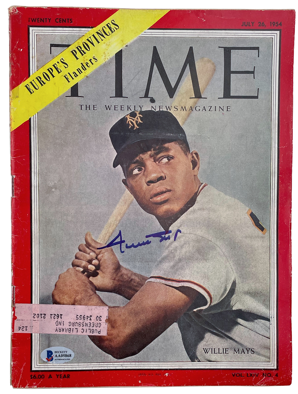 July 26, 1954 "Time" magazine has been hand-signed by Willie Mays (San Francisco Giants, HOF). Please note, the corners show signs of wear.