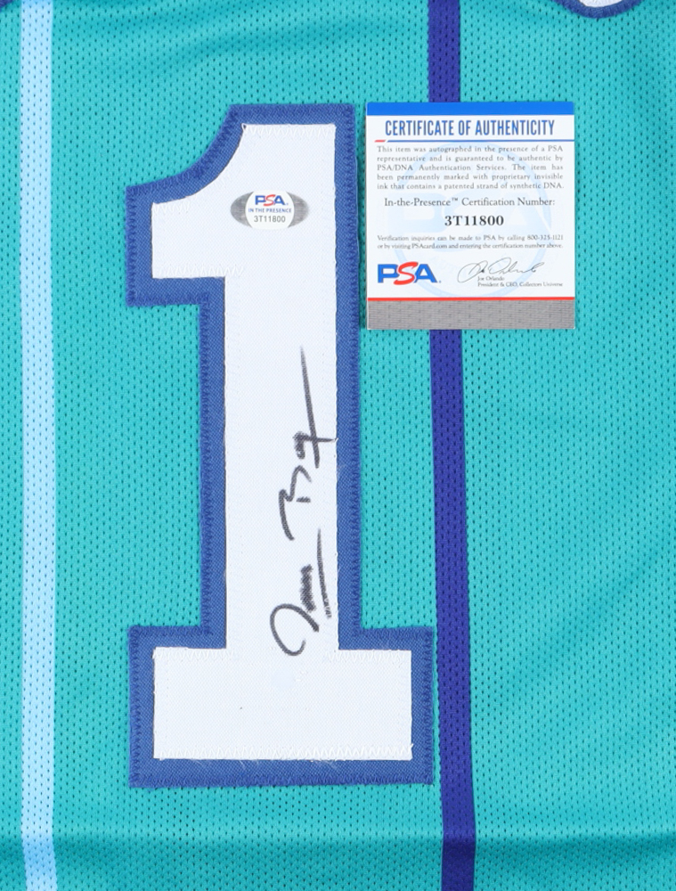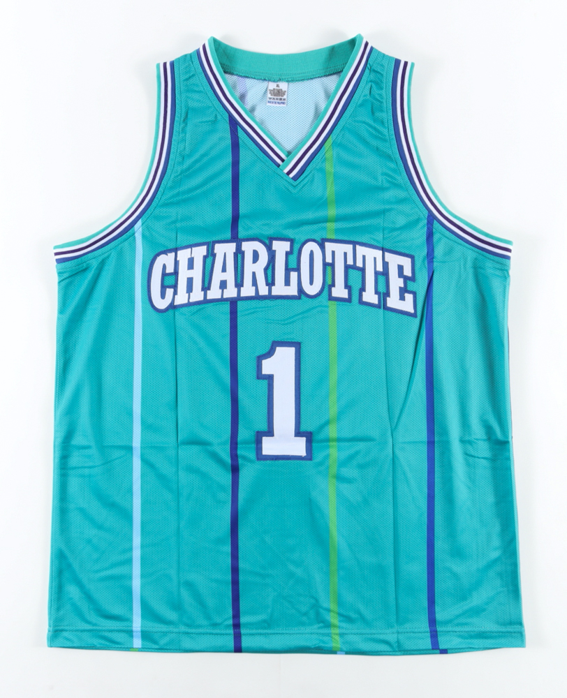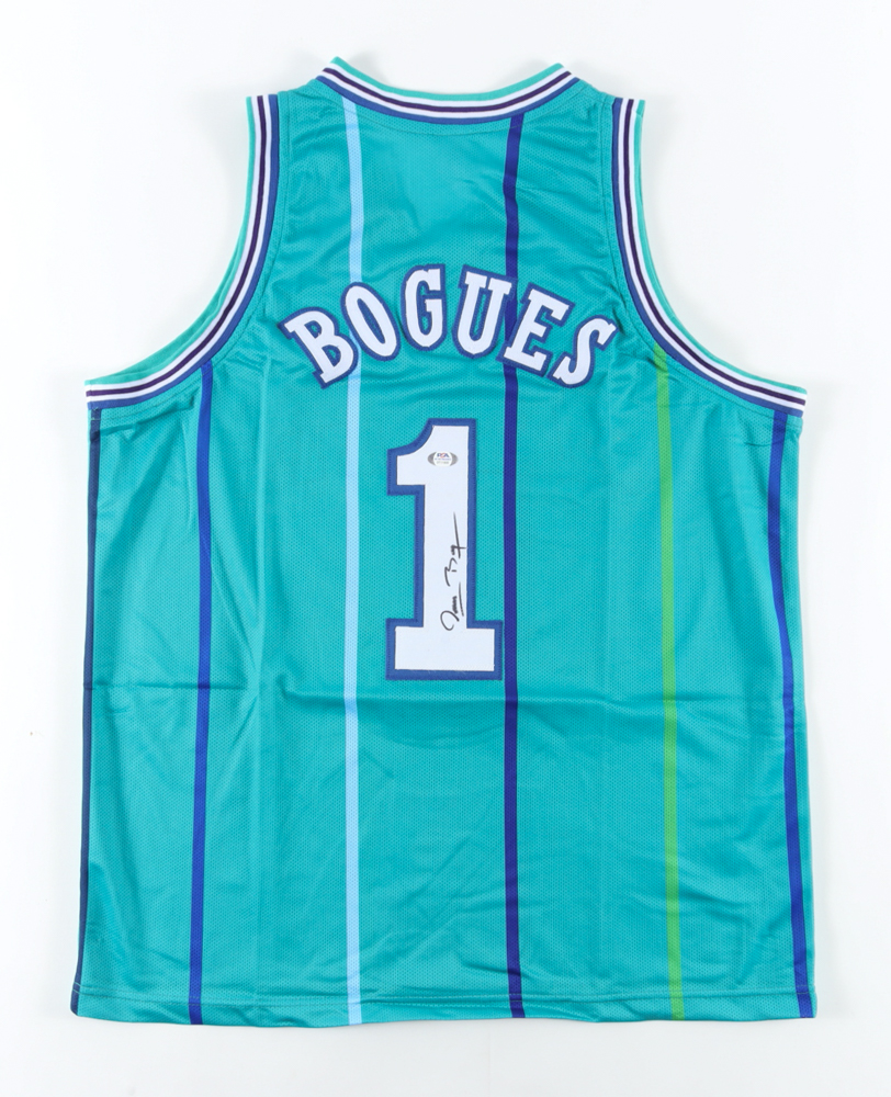 Custom on-court style jersey. Everything is sewn on, size XL. Hand-signed by Muggsy Bogues.