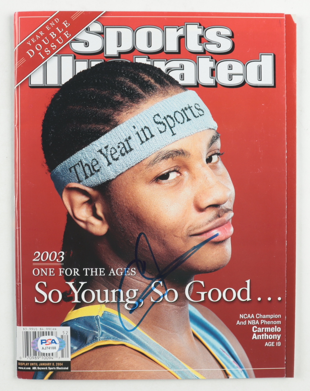 January 8th, 2004 "Sports Illustrated" magazine has been hand-signed by Carmelo Anthony (Denver Nuggets). Please note, the magazine shows signs of wear in the corners and on the edge. See photos for details.