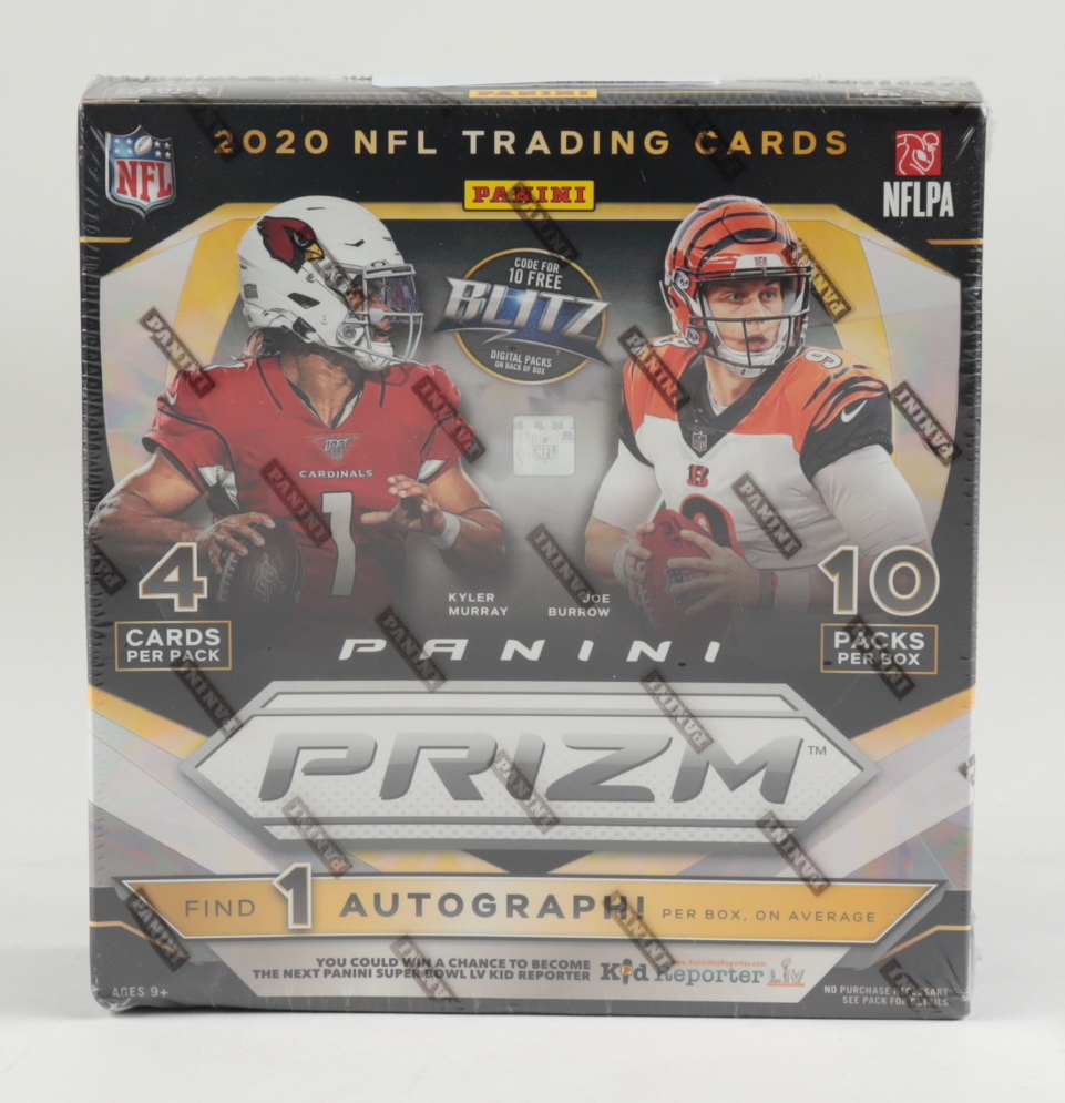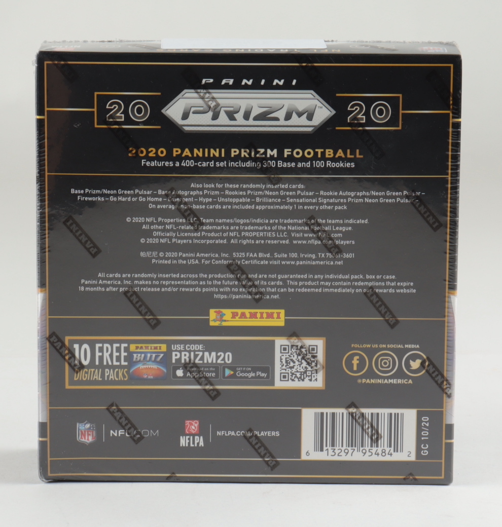 (10) Packs Per Box, (4) Cards Per Pack Please note, the packaging shows some handling wear - see images for details regarding condition. Prizm returns for the highly anticipated 2020 NFL season! Collect the colorful content that collectors around the world have come to know and love! Find 1 Mega Box Exclusive Neon Green Pulsar Prizms, per box, on average and look for Exclusive Neon Green Pulsar Prizm Autographs. Find one of the deepest NFL rookie classes of all-time in the 100-card rookie set! Every box delivers 10 rookies, on average! Featuring Rookie Cards of Joe Burrow, Tua Tagovailoa, Justin Herbert, Clyde Edwards-Helaire, Jerry Jeudy, CeeDee Lamb, Jalen Hurts, Clyde Edwards-Helaire, Jacob Eason, Henry Ruggs III, Justin Jefferson, Laviska Shenault Jr., Jonathan Taylor, J.K. Dobbins, Zack Moss, Brandon Aiyuk, Chase Young, Isaiah Simmons, Cole Kmet, Jordan Love, and Chase Claypool. PRODUCT BREAKDOWN: BASE: Prizm returns with a 300-card base set that is loaded with veterans and legends from every franchise! Silver (not #'d) Neon Green Pulsar (not #'d) ROOKIES: Find 100 of the NFL's top newcomers in Rookies. Find the Neon Green Pulsar Prizm parallel, only found in the NPP Retail Mega Box! Look for Silver Prizms, falling one per box, on average! Silver (not #'d) Neon Green Pulsar (not #'d) ROOKIE AUTOGRAPHS: The NPP Retail Mega Box delivers 1 Autograph per box, on average! Look for exclusive Neon Green Pulsar Prizm Autographs! GO HARD OR GO HOME!: Find this new insert in 2020 Prizm. Find the hardest working players in the NFL! FIREWORKS: Find this Prizm staple back for 2020 Prizm. Find this vibrant design with the most electrifying talent!