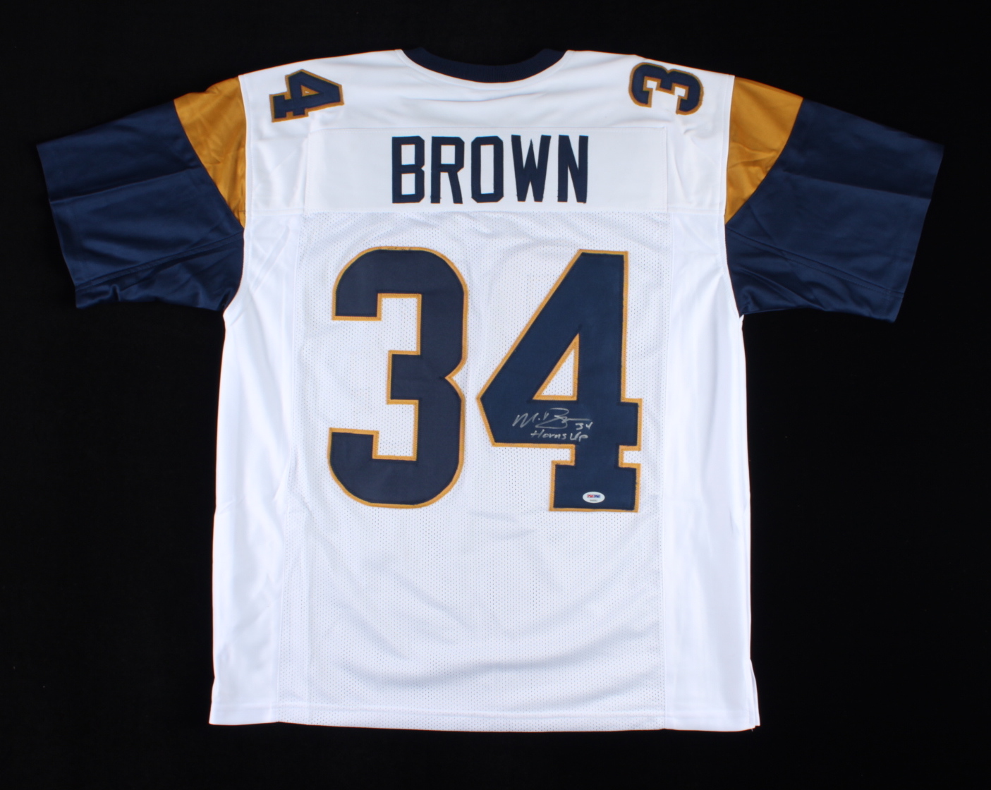 Custom on-field style jersey. Everything is sewn on, size XL. Has been hand-signed and inscribed by Malcolm Brown.