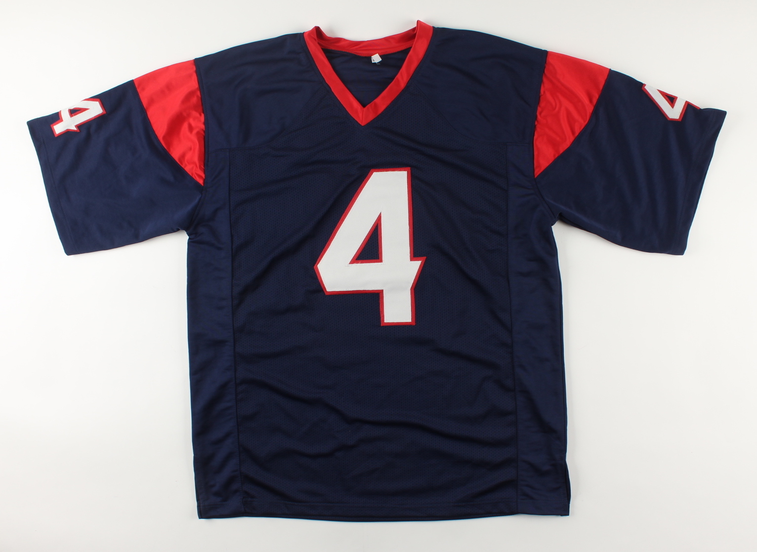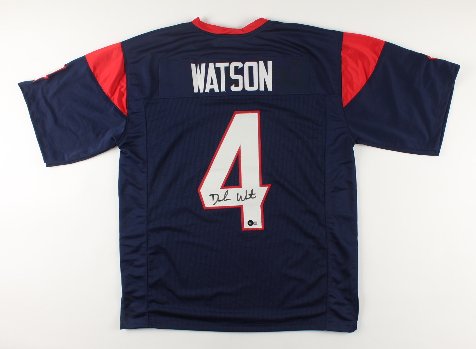 Custom on-field style jersey. Everything sewn on, size XL. Hand-signed by Deshaun Watson.