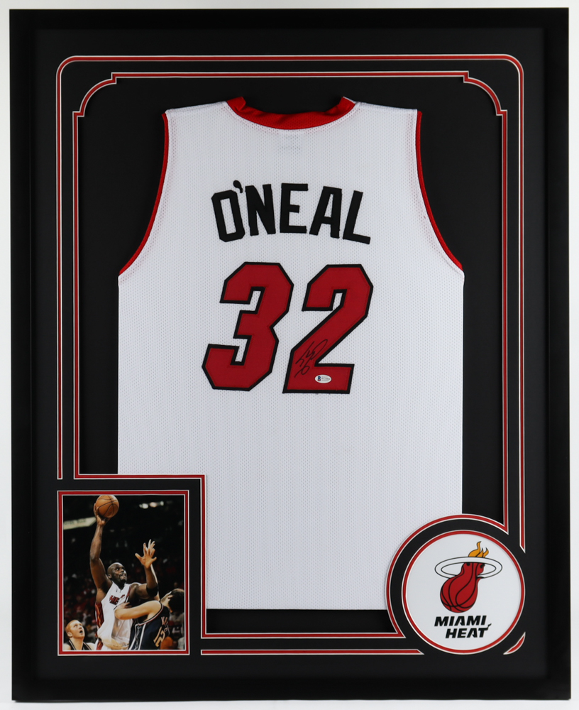 Custom frame measures 34" x 42" in size and features a jersey hand-signed by Shaquille O'Neal (HOF). Please note there is a small stain be low the reverse numbers on the jersey.