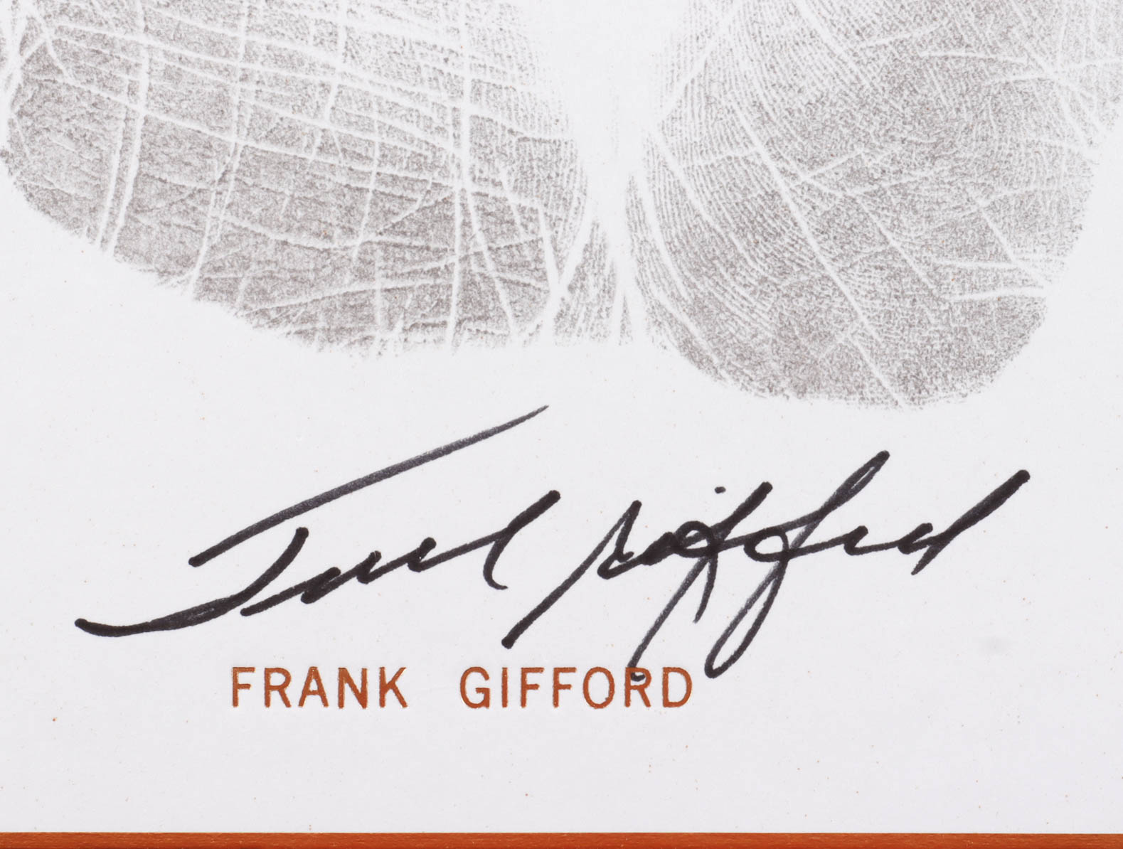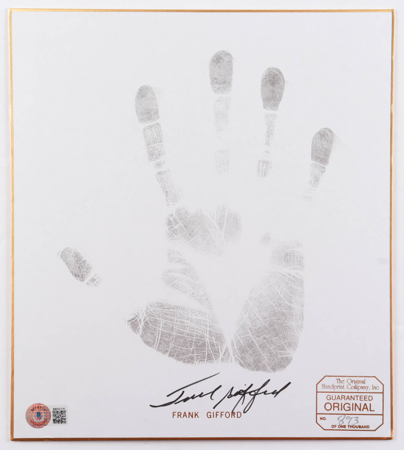 Original handprint measures approximately 9.5" x 11" in size. Hand-signed and handprinted by Frank Gifford (D. 2015, New York Giants, HOF). Print is limited edition and has been hand-numbered #893/1000.