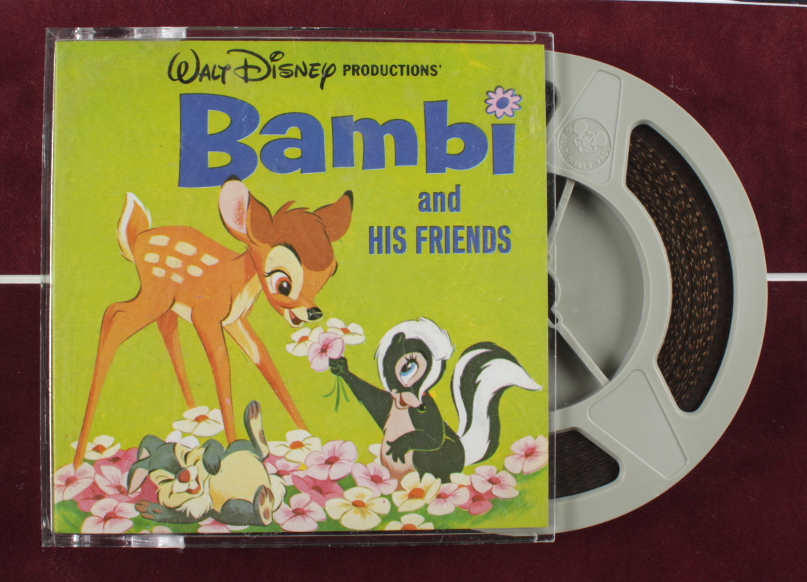 Custom framed display measures 16" x 25.5" in size and features a vintage 8mm film reel from "Bambi"in the original box as well as a poster of the film. Please see photos for more information.