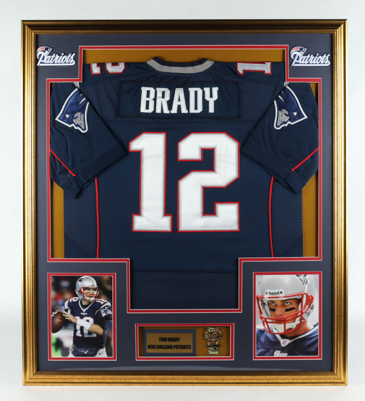 Custom frame measures 32" x 36" in size and features a jersey of Tom Brady and includes a Super Bowl XXXVI Champions pin, (2) 8" x 10" photos, and (2) Patriots patches. Please note, there are marks on the numbering, and the jersey is not signed.