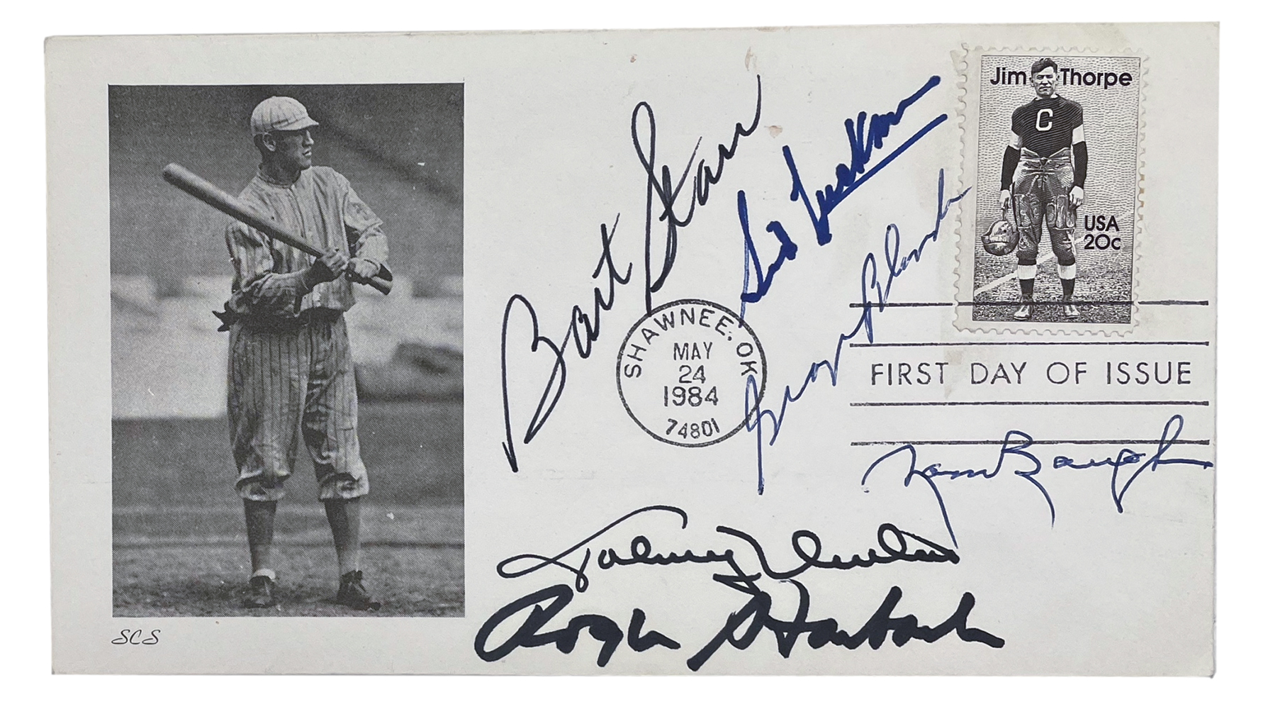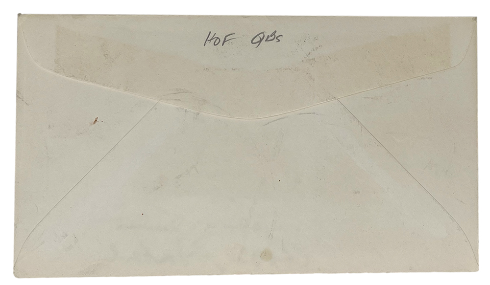 First Day of Issue envelope dated May 24, 1984. Hand signed by Bart Starr (D.2019, Green Bay Packers, HOF), George Blanda (D.2010, Oakland Raiders, HOF), Johnny Unitas (D.2002, Baltimore Colts, HOF), Sammy Baugh (D.2008, Washington Redskins, HOF) & Roger Staubach (Dallas Cowboys, HOF). Please note, the signature of Sid Luckman has been deemed a club house version.