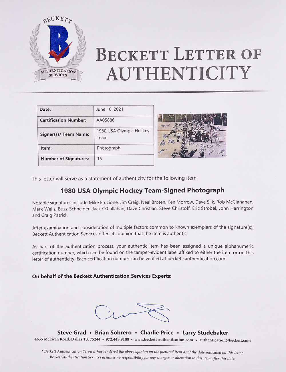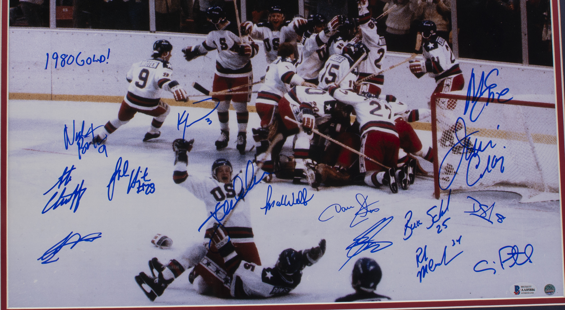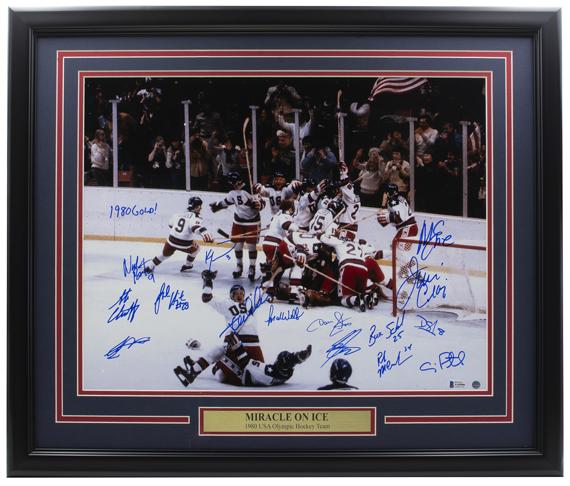 Custom frame measures 22" x 27" in size. Display features a photo that has been hand-signed by Neal Broten, Ken Morrow, Mike Eruzione, Jim Craig, Buzz Schneider, Rob McClanahan, Dave Silk, Jack O'Callahan, Mark Wells, John Harrington, Steve Christoff, Dave Christian, Eric Strobel, Craig Patrick and Steve Janaszak.