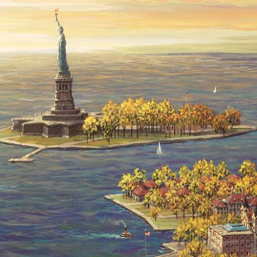 Chen creates stunningly detailed masterpieces filled with elaborate icons and a touch of fantasy. "Ellis Island - Fall" is a limited edition mixed media on paper by Alexander Chen, numbered and hand-signed by the artist. This image was produced using the techniques of both offset lithography and serigraphy to create a remarkable piece. Measures approximately 14" x 10" (with border), 12" x 8" (image).
