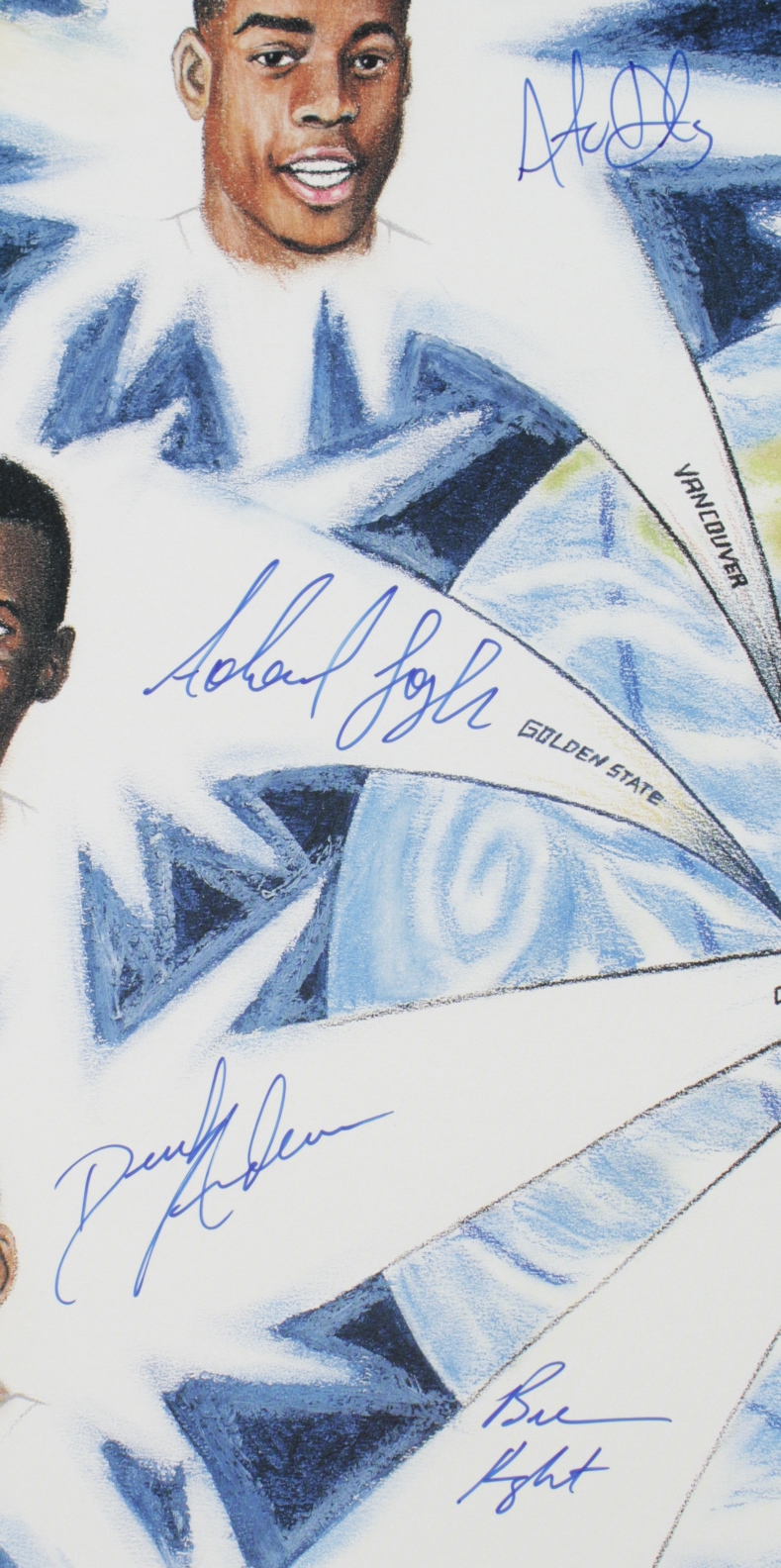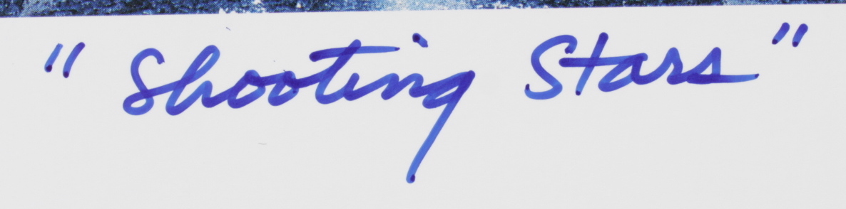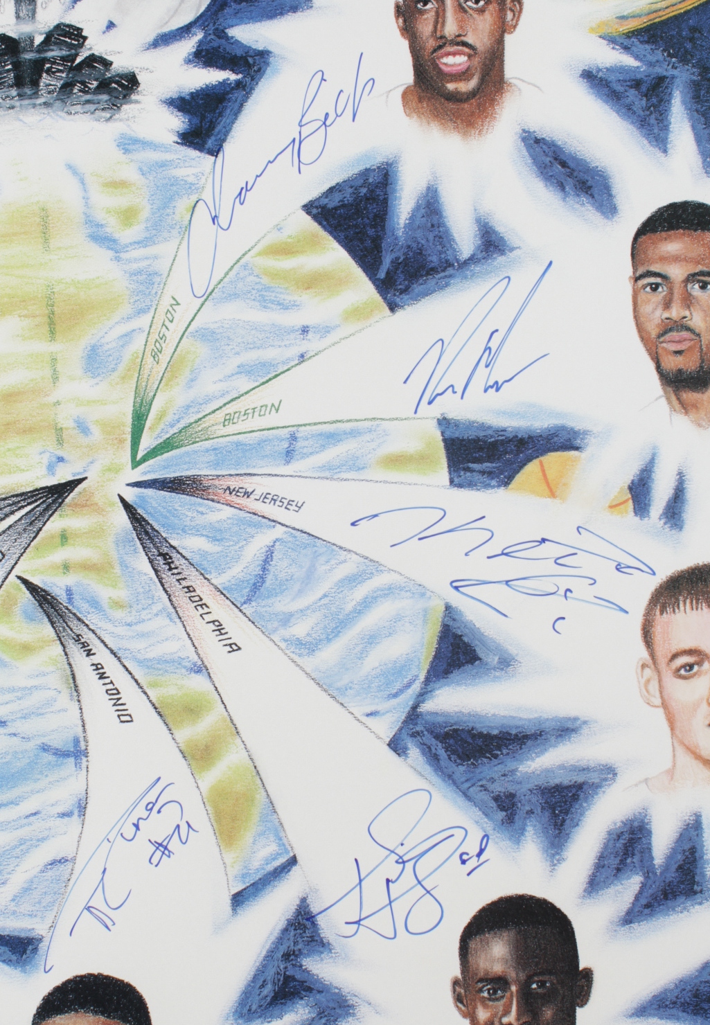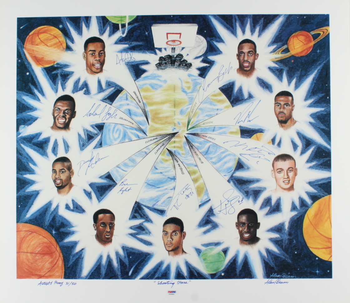 "Shooting Stars" lithograph measures approximately 23.5" x 26.5" in size. The piece is hand-signed by (9) including Tim Duncan, Chauncey Billups, Keith Van Horn, Tim Thomas, Derek Anderson, Ron Mercer, Adonay Foyle, Antonio Daniels, and Brevin Knight. Lithograph is Limited Edition #31/50. Please note, lithograph is also signed by the artist Alan Beam.