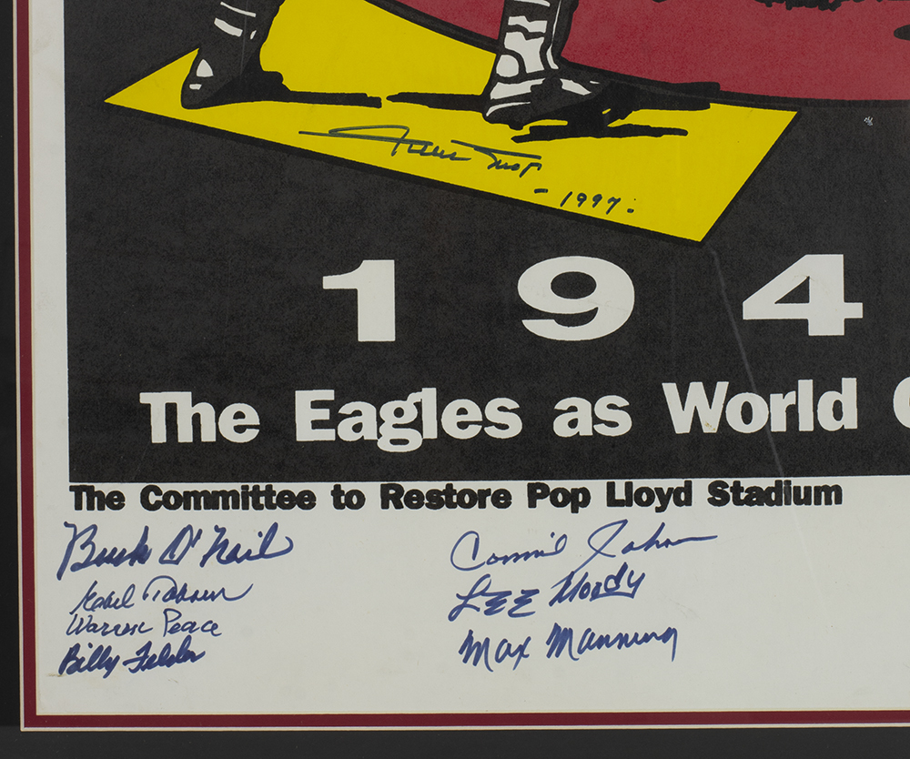 Custom framed display measures 32" x42" x 2" in size and features a poster that has been hand-signed by Michael Jordan, Willie Mays (HOF), Connie Johnson, Max Manning, Lee Moody, Buck O'Neil, William Felder and Warren Peace.