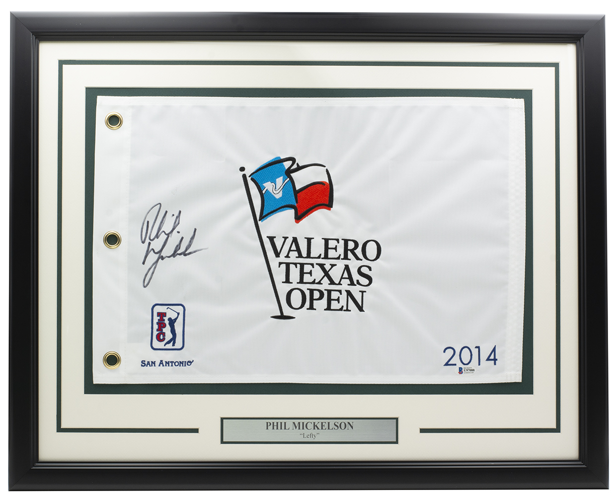 Custom framed display measures 20" x 30" in size and features a 2014 Valero Texas Open pin flag that has been hand-signed by Phil Mickelson (HOF).