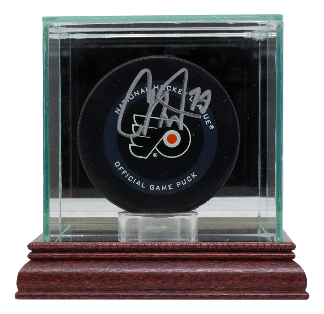 Philadelphia Flyers logo hockey puck has been hand-signed by Carter Hart. Display case included as shown.