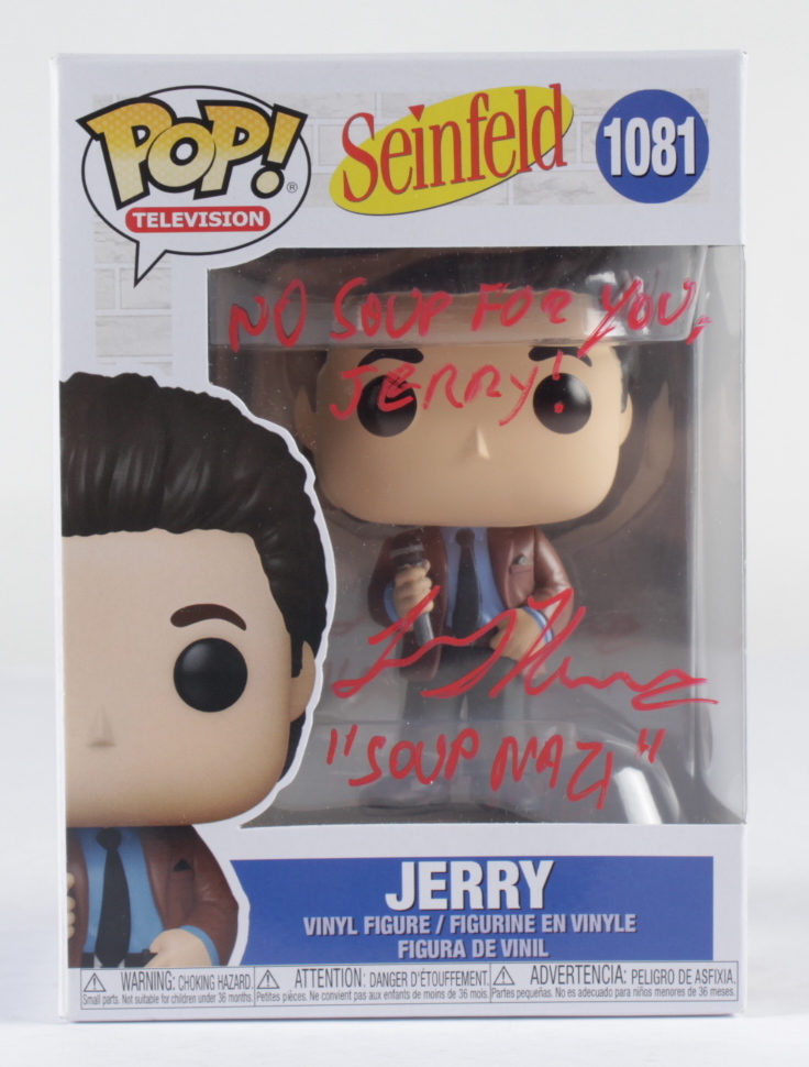 Larry Thomas Signed "Seinfeld" #1081 Jerry Funko Pop! Vinyl Figure Inscribed "No Soup For You, Jerry!" & "Soup Nazi" (PSA COA) (See Description)