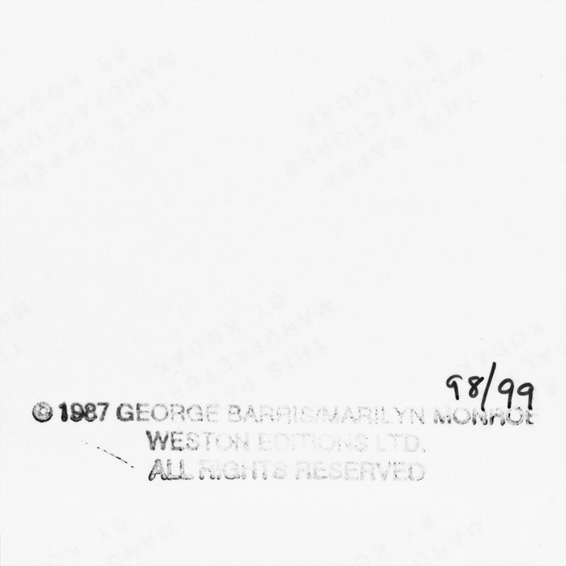 "Marilyn Monroe: The Last Shoot" is a photograph printed from the original negative taken by George Barris (1922-2016). This photo is part of a series entitled "The Last Photos"; they were taken in 1962 just two weeks before Monroe's death and are considered the last photos ever taken of the icon. This piece is numbered inverso 98/99 and hand signed by the photographer. This photo bears the Edward Weston copyright stamp inverso and Includes Letter of Authenticity. Measures approx. 11" x 14" (image).