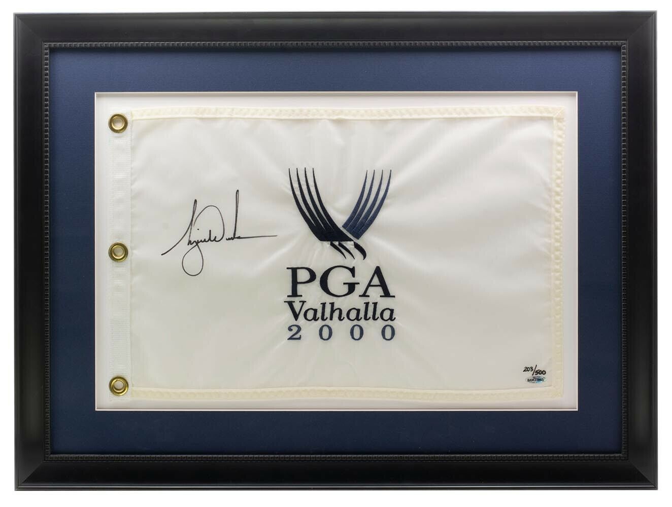Custom Framed display measures 22" x 30" in size. Features 2000 PGA Valhalla Championship pin flag. Hand-signed by Tiger Woods. Please note, item is limited edition #203/500.