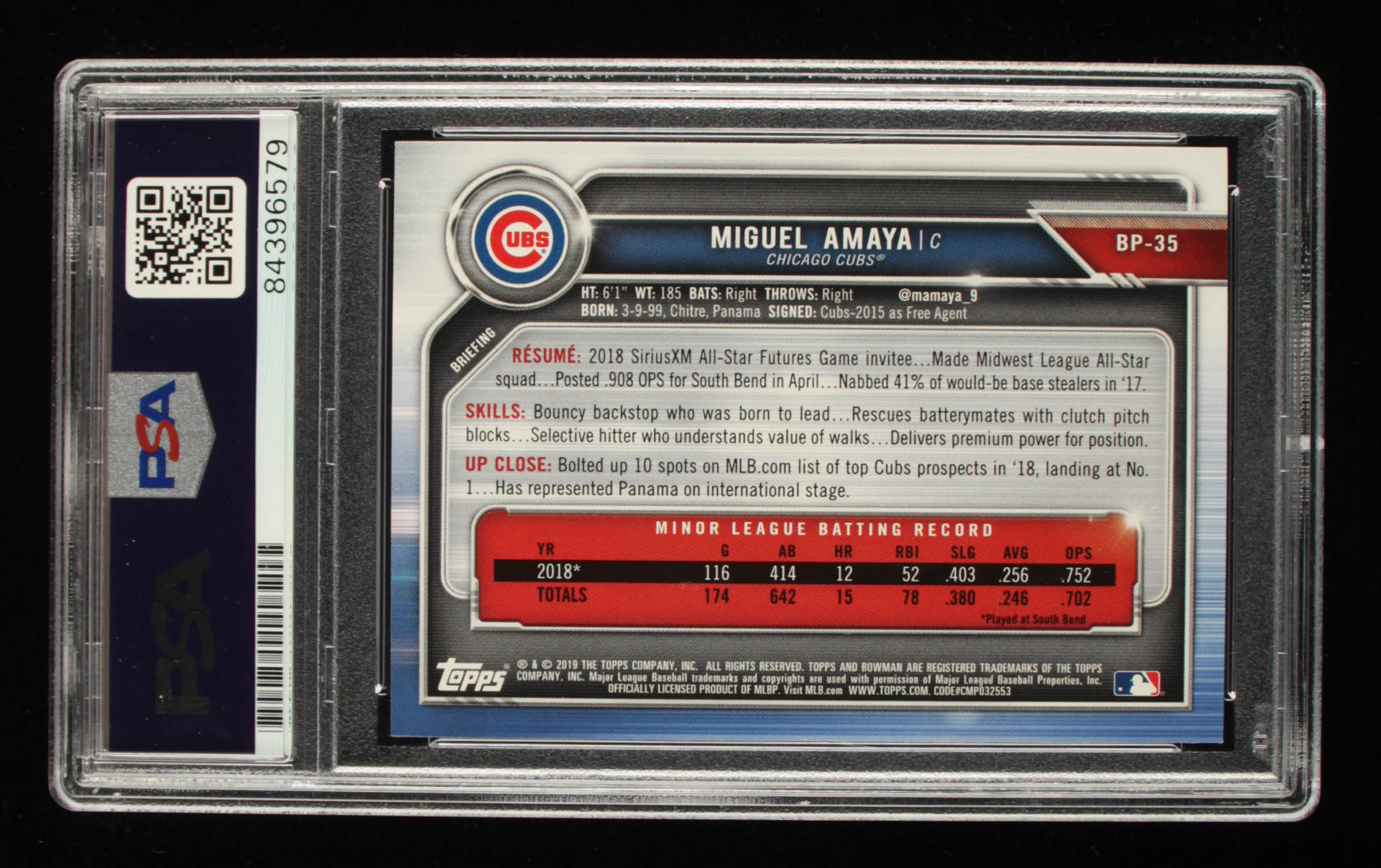 Miguel Amaya Signed 2019 Bowman Prospects #BP35 (PSA Encapsulated)