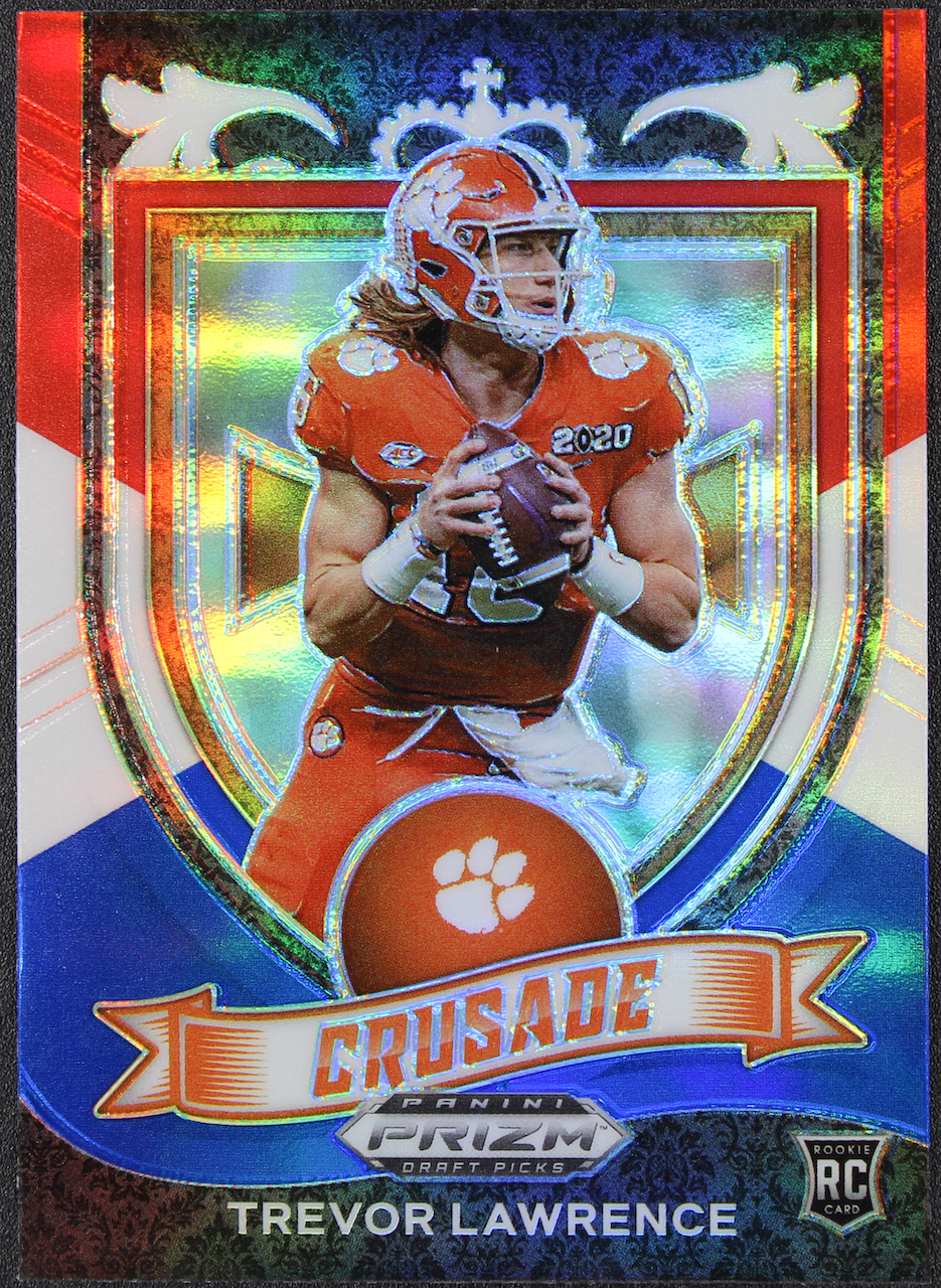 Trevor Lawrence 2021 Panini Prizm Draft Picks Prizms Red White and Blue Crusade #161 RC