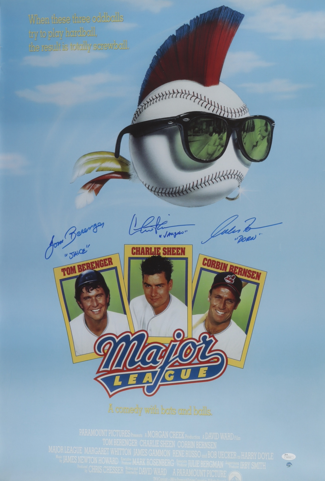 Charlie Sheen, Tom Berenger & Corbin Bernsen Signed "Major League" 24x36 Movie Poster with Character Name Inscriptions (JSA Hologram) (See Description)