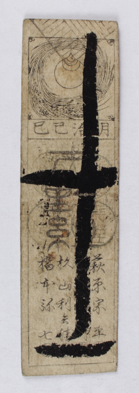 Please see scans for details. During the Edo period, feudal domains of Japan issued scrip called hansatsu (clan note) for use within the domain. This paper currency supplemented the coinage of the Tokugawa shogunate. Most scrip carried a face value in silver coinage, but gold and copper scrip also circulated. In addition, some scrip was marked for exchange in kind for a commodity such as rice. In addition to those issued by the domains, forms of paper money were also issued by rice brokers in Osaka and Edo. The shogunate prohibited the use of scrip in 1707. In 1730, however, Tokugawa Yoshimune authorized domains to issue paper with time limits for redemption. Large domains could issue currency valid for 25 years, and small domains for 15 years. His son Ieshige prohibited new issue of scrip, and restricted the circulation of scrip other than that exchangeable for silver, in 1759. Despite the prohibitions, domains in severe financial straits occasionally issued paper money. Each domain formulated its own rules about its scrip. While there were some that forbade the shogunate's coinage, many allowed both coins and scrip to circulate. As a rule, scrip circulated only within the domain that issued it, but there were exceptions. For example, paper issued by the Kish? domain in 1866 was also used in Yamato, Izumi, Kawachi, Settsu, and Harima Provinces. In 1871, the Government of Meiji Japan ordered the abolition of the han system and ordered the exchange of all scrip for the national currency. Exchange continued until 1879. In the interim, some scrip carried markings from the central government indicating the value in yen and the smaller sen and rin.