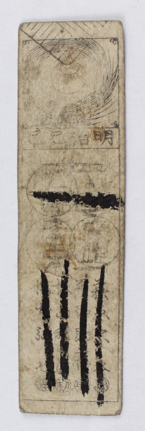 Please see scans for details. During the Edo period, feudal domains of Japan issued scrip called hansatsu (clan note) for use within the domain. This paper currency supplemented the coinage of the Tokugawa shogunate. Most scrip carried a face value in silver coinage, but gold and copper scrip also circulated. In addition, some scrip was marked for exchange in kind for a commodity such as rice. In addition to those issued by the domains, forms of paper money were also issued by rice brokers in Osaka and Edo. The shogunate prohibited the use of scrip in 1707. In 1730, however, Tokugawa Yoshimune authorized domains to issue paper with time limits for redemption. Large domains could issue currency valid for 25 years, and small domains for 15 years. His son Ieshige prohibited new issue of scrip, and restricted the circulation of scrip other than that exchangeable for silver, in 1759. Despite the prohibitions, domains in severe financial straits occasionally issued paper money. Each domain formulated its own rules about its scrip. While there were some that forbade the shogunate's coinage, many allowed both coins and scrip to circulate. As a rule, scrip circulated only within the domain that issued it, but there were exceptions. For example, paper issued by the Kish? domain in 1866 was also used in Yamato, Izumi, Kawachi, Settsu, and Harima Provinces. In 1871, the Government of Meiji Japan ordered the abolition of the han system and ordered the exchange of all scrip for the national currency. Exchange continued until 1879. In the interim, some scrip carried markings from the central government indicating the value in yen and the smaller sen and rin.