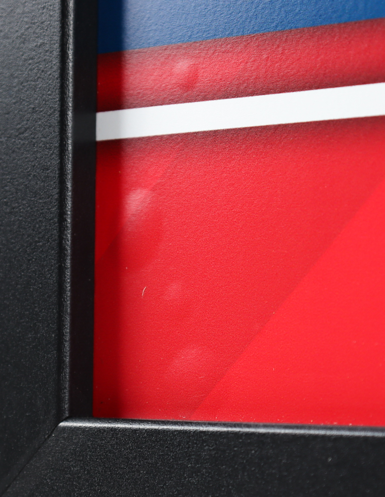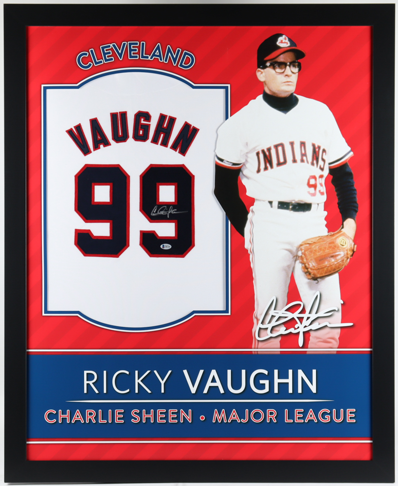 Custom frame measures 35.5" x 43.75" and features a jersey hand-signed by Charlie Sheen (Ricky "Wild Thing" Vaughn). Please note. there are bubbles in the italic near the bottom left corner of the frame.