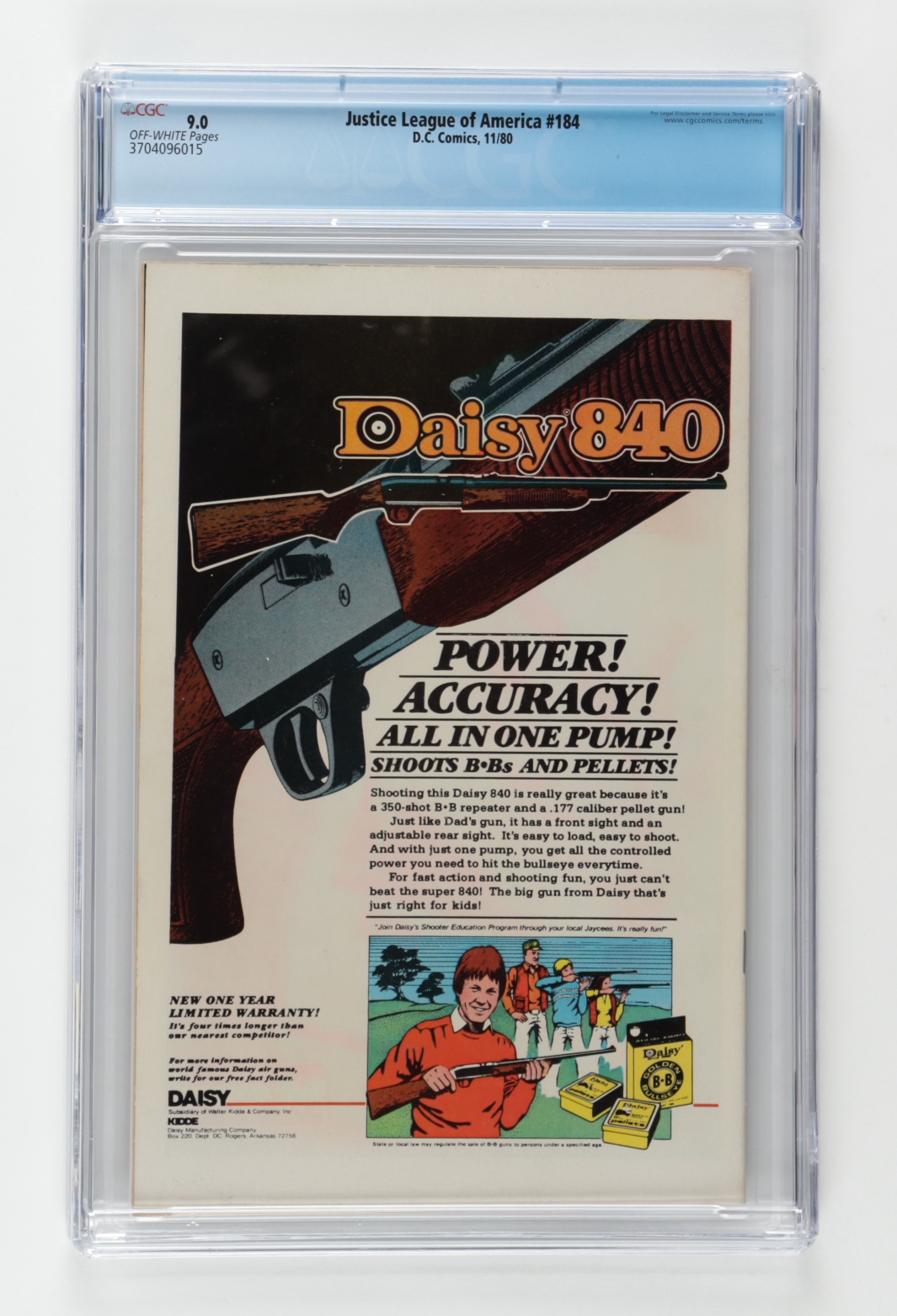 1980 "Justice League Of America" Issue #184 D.C. Comic Book. The comic book has been given a grade of (CGC) 9.0.