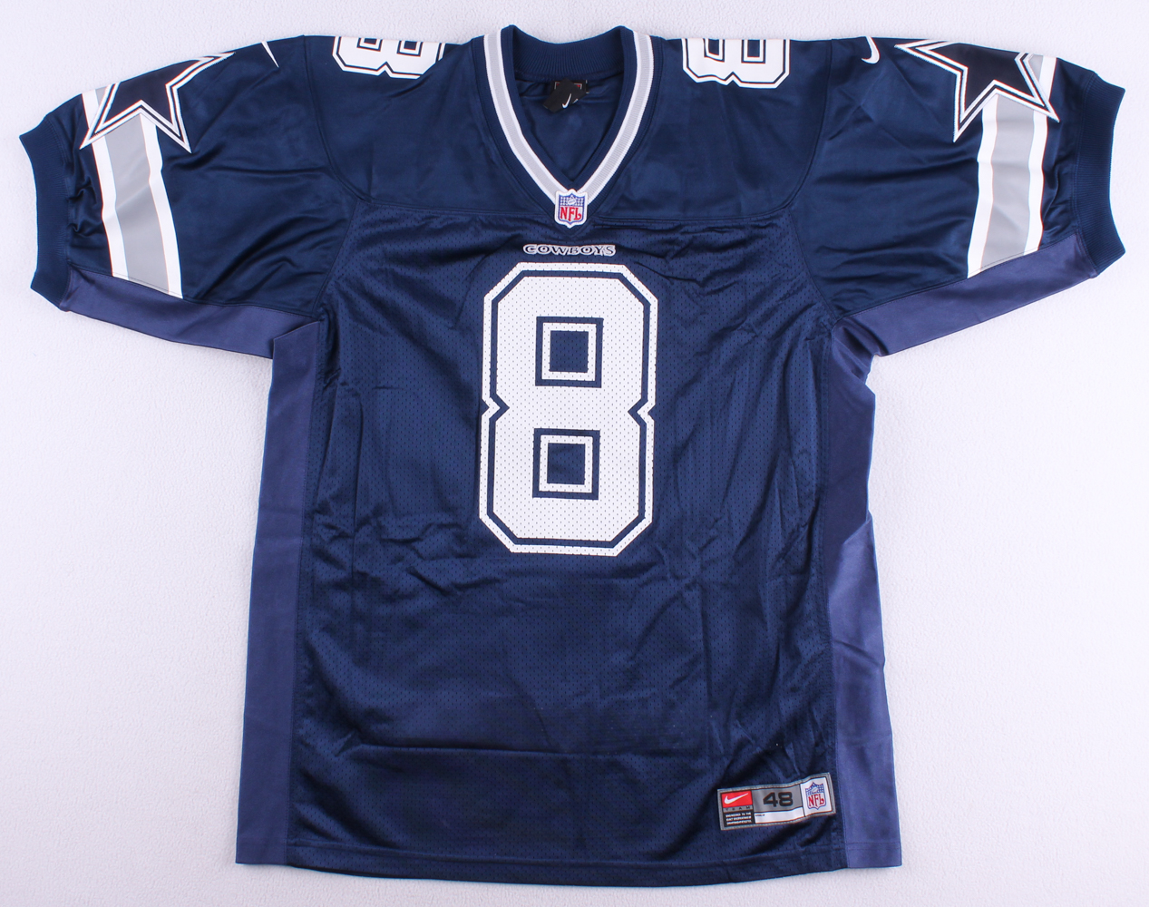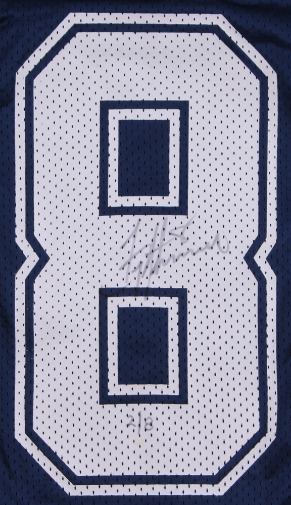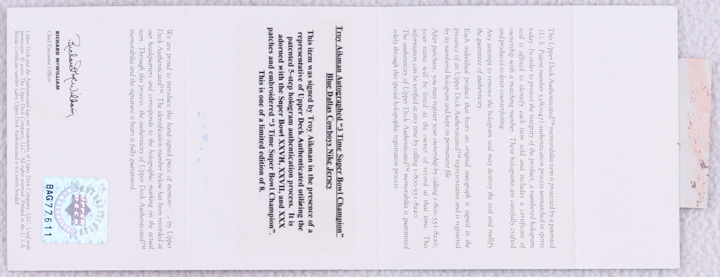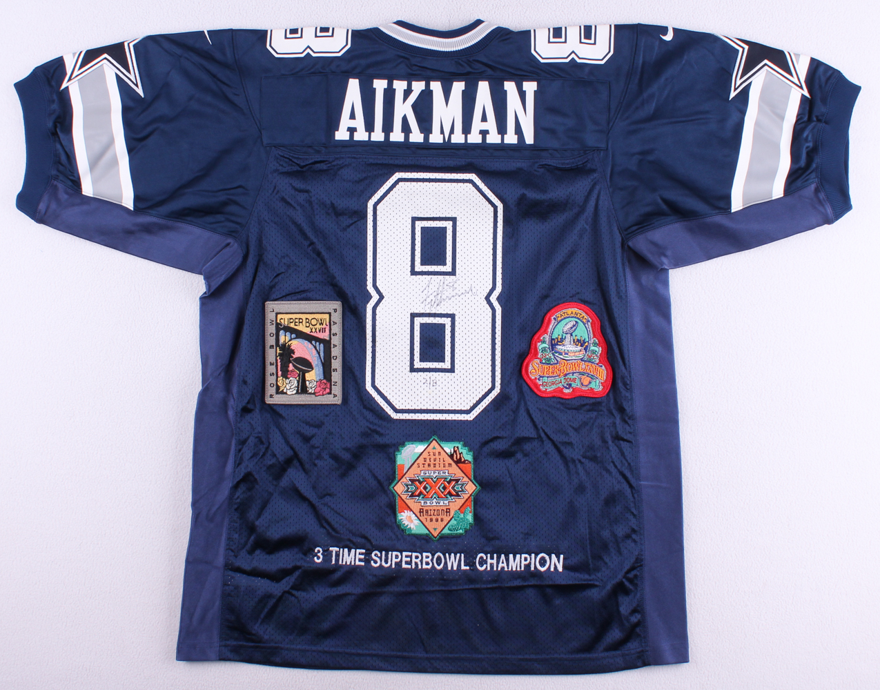 Nike on-field style jersey. Everything sewn on, size XL. Hand-signed in black felt tip pen by Troy Aikman (Cowboys HOF). Also jersey includes (3) super bowl patches.