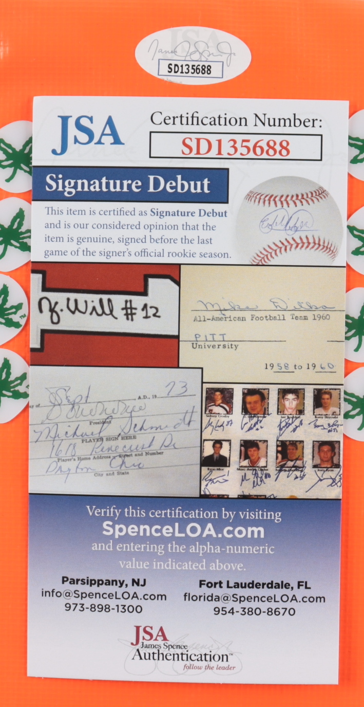 The autograph(s) includes an official James Spence Authentication (JSA) "Signature Debut" hologram and COA. "Signature Debut" is the autographed memorabilia equivalent to a rookie card. The JSA definition of a "Signature Debut" is as follows: "Any item that is autographed and received by JSA prior to the last game of the signer's official rookie season. Authentication: JSA COA