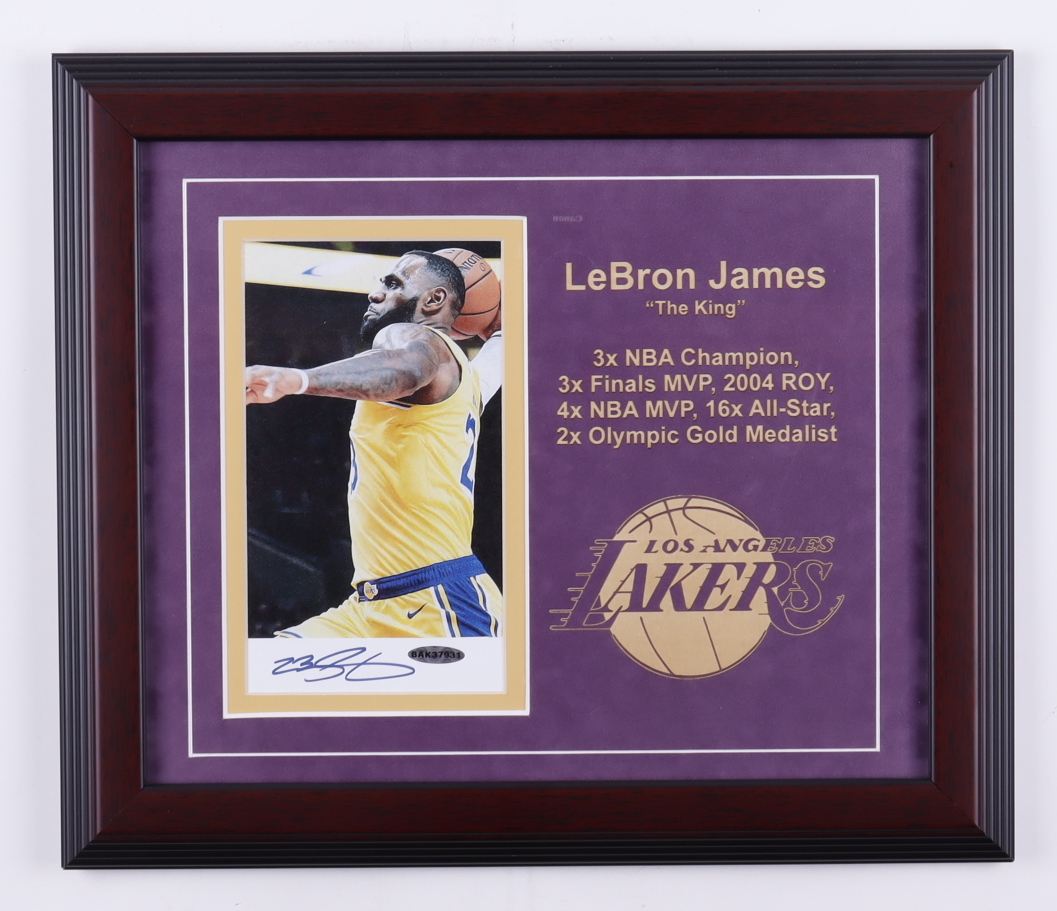 Custom framed photo display measures approximately 14" x 17" in size and has been hand-signed by LeBron James (Los Angeles Lakers).
