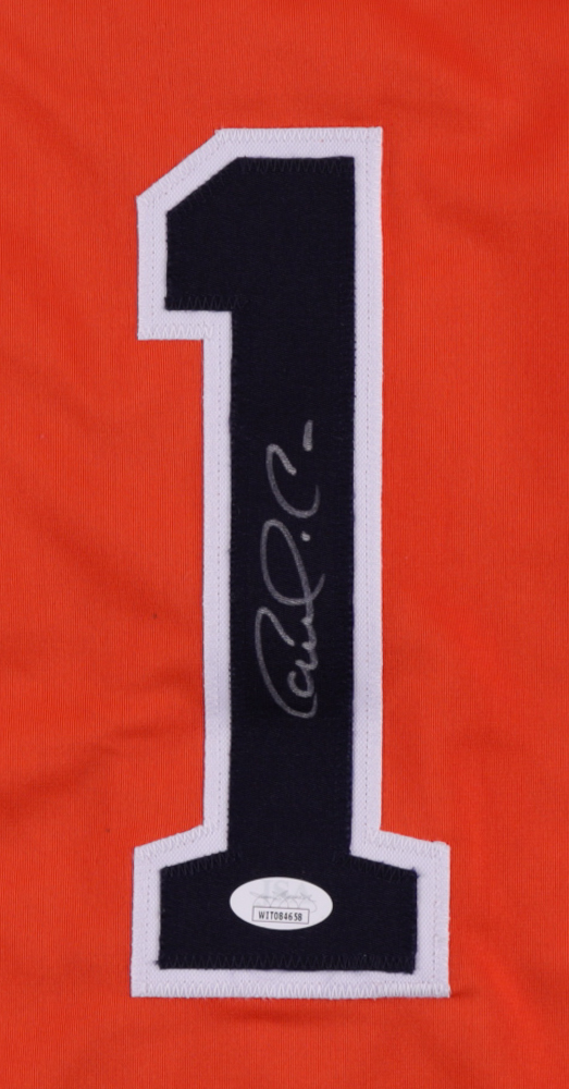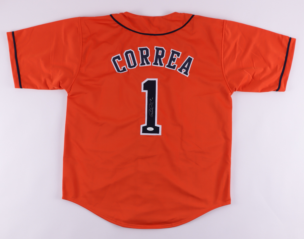 Custom on-field style jersey. Everything is sewn on, size XL. Hand-signed by Carlos Correa.