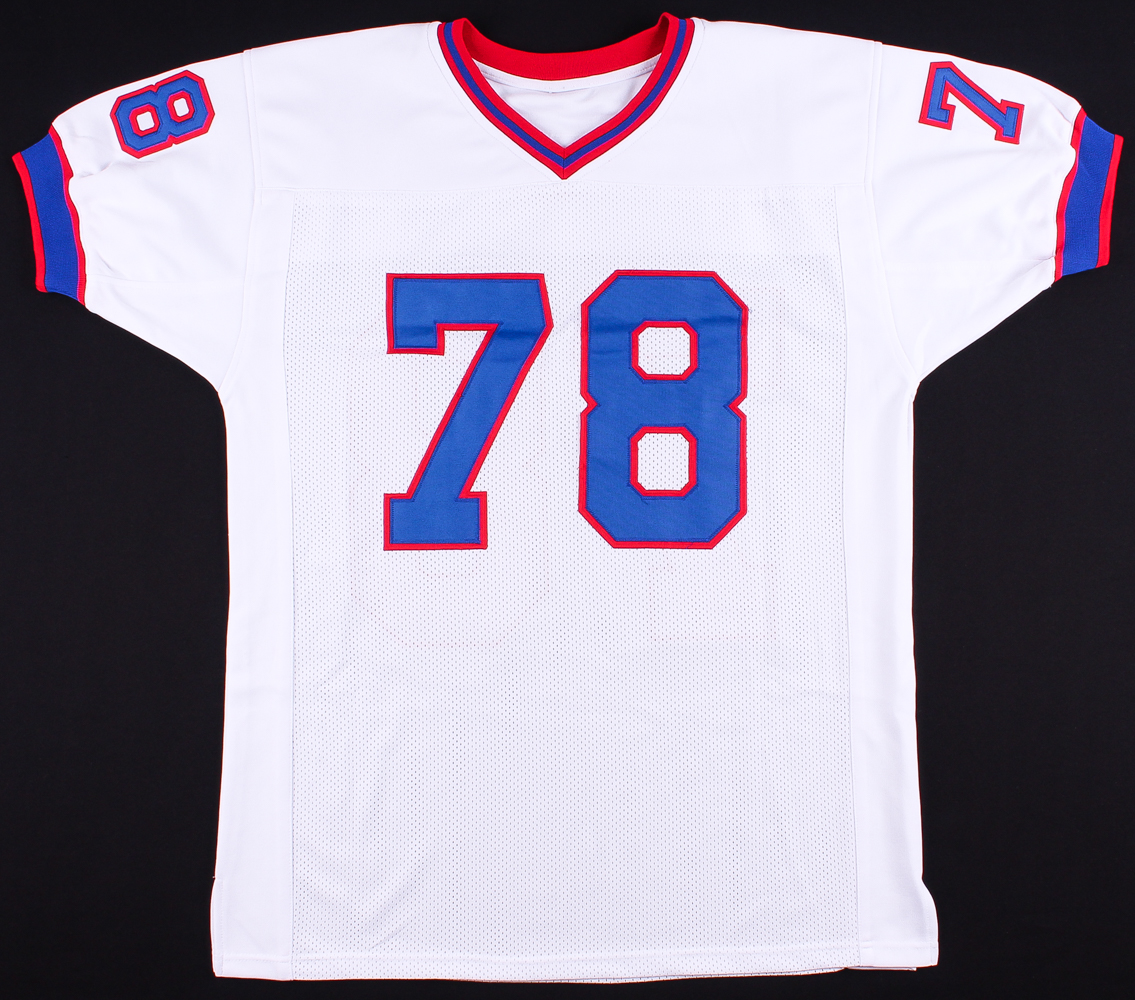 Custom on-field style jersey. Everything is sewn on, size XL. Hand-signed in silver paint pen by Bruce Smith (Redskins HOF).